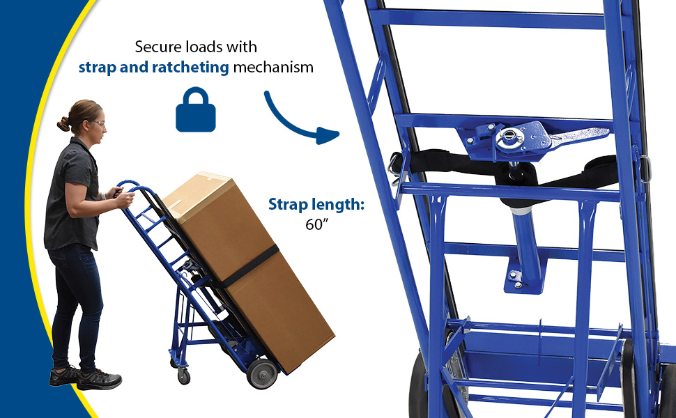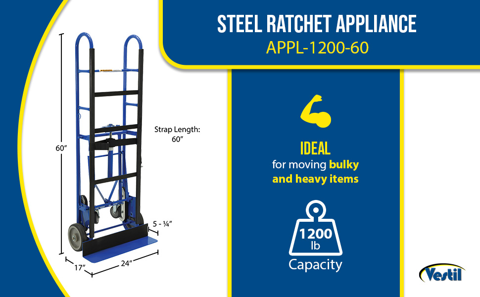APPL seriesThis cart is ideal for moving large, bulky, heavy appliances, and awkward loads. A strap and tension bar are included with this unit to hold the product in place while transporting up or down stairways, hills, or uneven surfaces. Strap length is 60" for the APPL-500 and APPL-750-B. The 1,200 lb. capacity models include (2) 4" x 1" thermos plastic rubber swivel rear casters, as well as strap retracts. The strap rectracts (from ratchet center) 80" on one side/81" on the other. Robust design can move and maneuver heavy loads like vending machines throughout workplace with ease.
