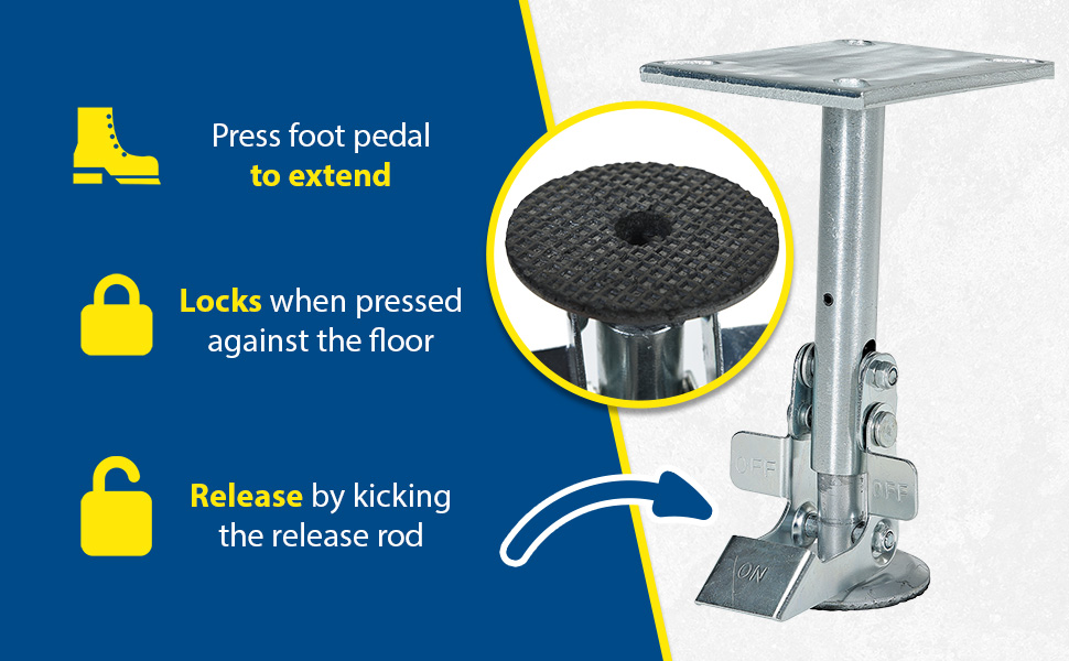 Floor Locks may be used on platform trucks, fixture dollies, or equipment with casters. Brake is independent of casters and can be installed to any convenient location on the cart. Designed to be mounted to sides of carts and other portable products. The spring loaded pad accommodates uneven floors. Units mount with pad 1-1/2" off the floor when retracted.