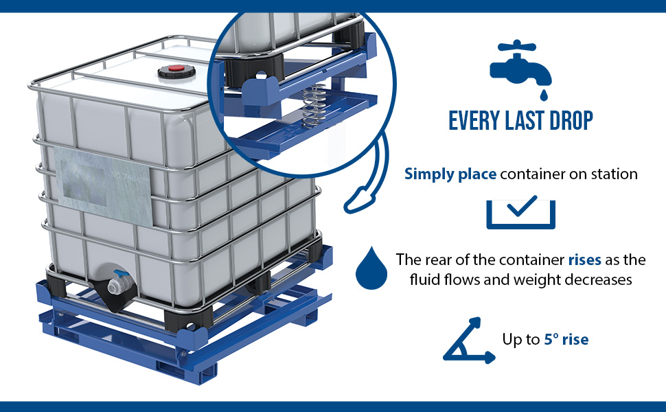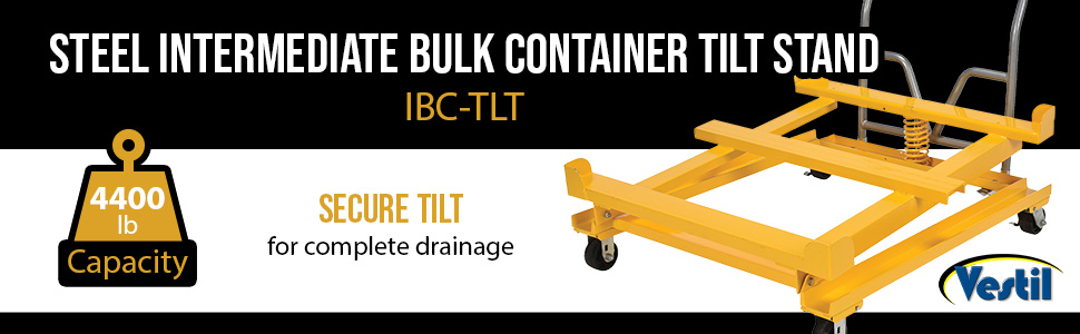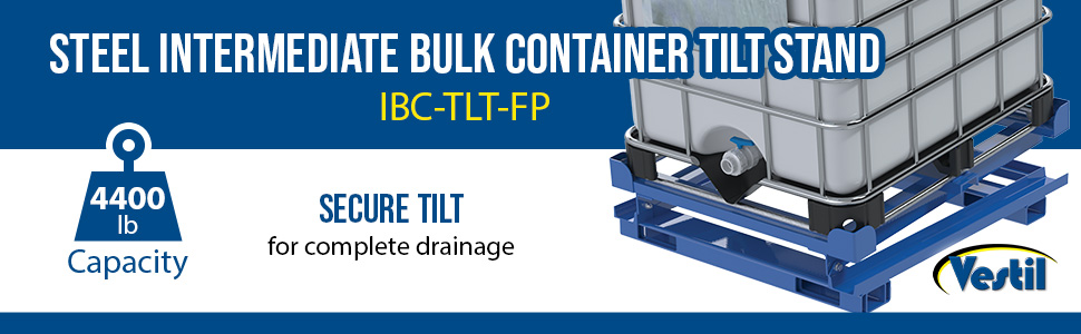 An Intermediate Bulk Container Tilt support stand is designed of a sturdy steel construction which, provides a secure tilting of containers for complete draining. The adjustable height of the stand allows for easy access to valve connections and minimizes user bending and twisting. To use, simply place the container on the stand. When the container is in the secure position, start the draining process. As the fluid flows from the container, the rear of the stand platform will rise up creating an angle for a better release of fluids. The stand has pre-drilled mounting holes for simple mounting to a variety of surfaces and fork pockets for simple movement, if necessary.