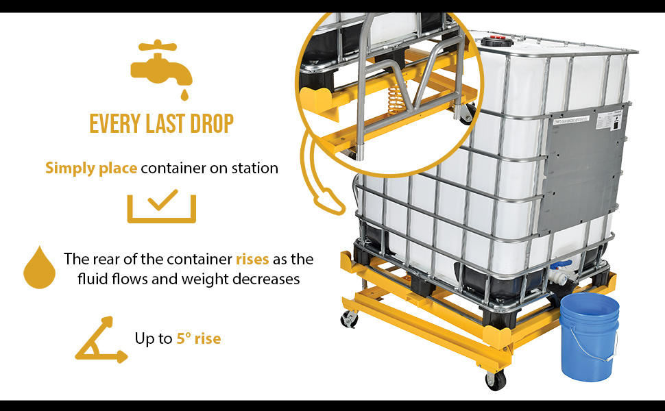 The intermediate bulk container tilting cart is built with a sturdy steel construction which provides a secure tilting of containers for complete draining. To use, simply place the container on the cart. When the container is in the secure position, start the draining process. As the fluid flows from the container, the rear of the cart will rise creating an angle for a better release of fluids. The cart rolls on casters for smooth transition from workstation to workstation.