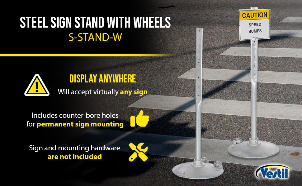 Display your signs anywhere. Surface mounted with a weighted base. Includes (3) holes, 9/16" diameter with 1-3/8" diameter counter-bore for permanent mounting of sign. Removable post will accept virtually any sign (sign & mounting hardware not included). Steel construction with painted bright zinc finish.