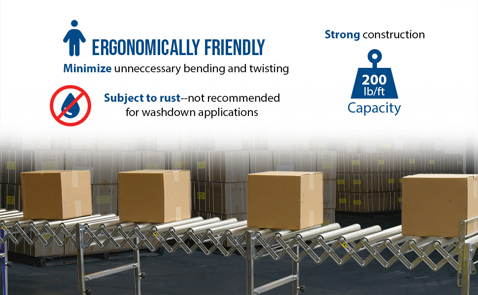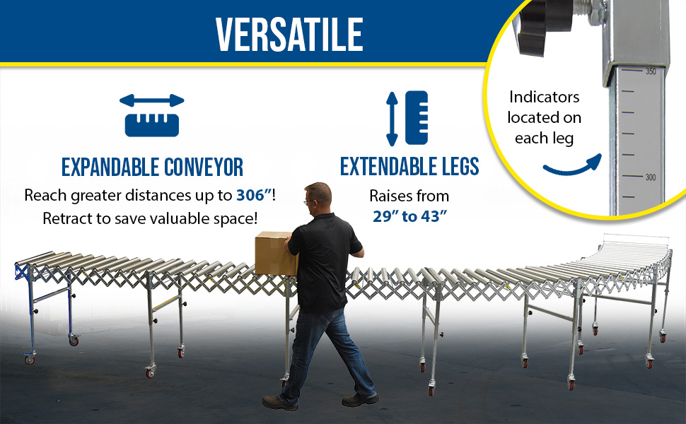 Expandable Roller Conveyor is the perfect asset for packaging and distributing facilities. The conveyor provides the user an ergonomically friendly way to transfer goods while minimizing the bending and twisting during shipping and handling. A strong construction provides strength for transferring large awkward products. The conveyor can be expanded to reach greater distances between packaging points. Once finished it can be retracted to fit in a condensed area.