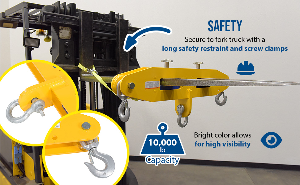A Forklift Lifting Beam is the perfect asset for maneuvering and transferring heavy objects. The centrally located hook between two fork pockets allow the user to safely attach to the unit and transport to the desired location. Hooks are also attached to the outside of the unit for a more secure lifting experience. The strong steel construction with a bright finish enables high visibility from both near and far. Secure to the fork truck by means of a 48" long safety restraint and screw clamps.
