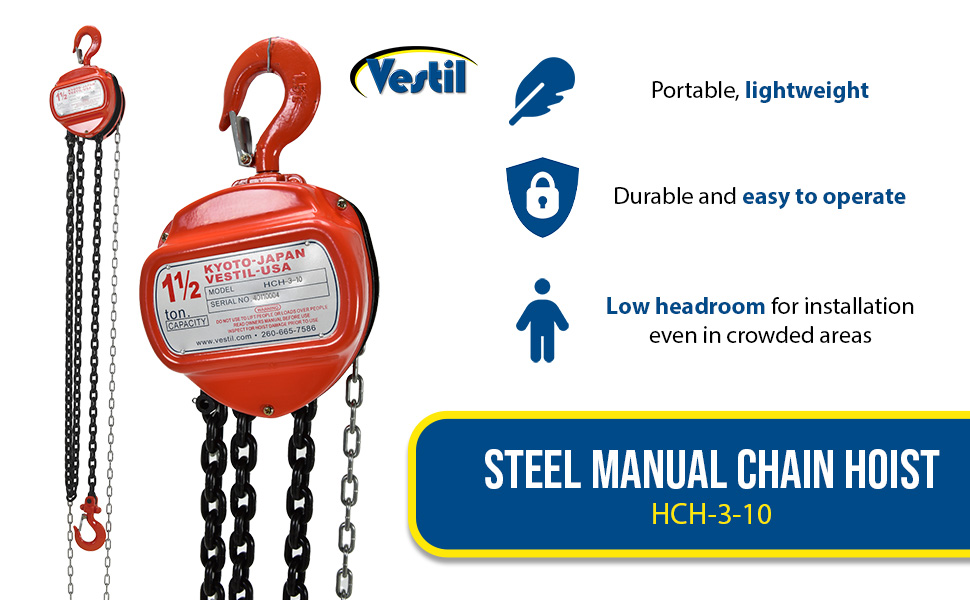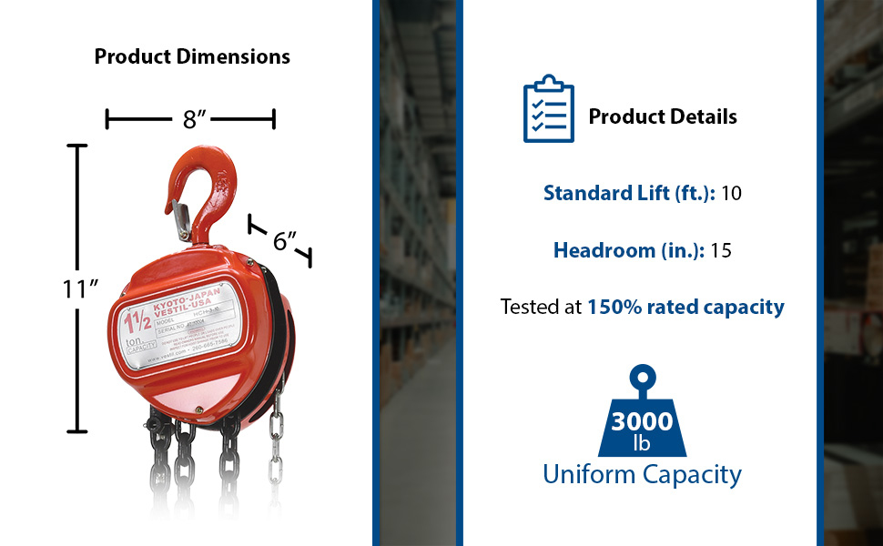 | Steel Manual Chain Hoist 10 Ft. Lift 3,000 Lb. Capacity Orange | Uniform Capacity (lb.): 3,000 Standard Lift (ft.): 10 | 43 |