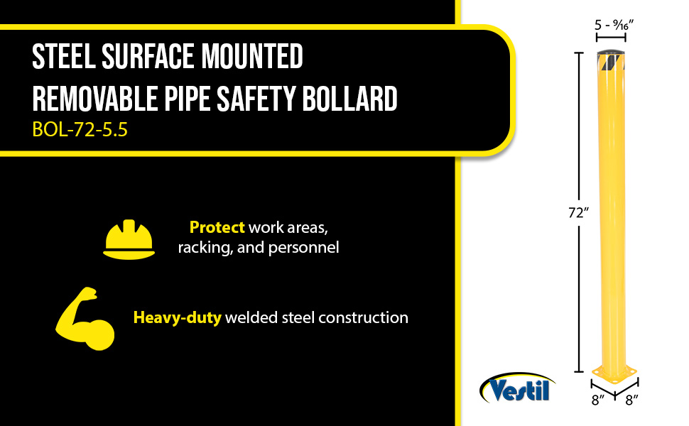 Bollards can be used both indoors and outdoors to protect work areas, racking and personnel. Caps are made of plastic and are removable when necessary. Bollards may be filled with concrete. Base plate includes four (4) pre-drilled mounting holes. Mounting kits and replacement caps available. Baked in powder coat or hot dipped galvanized finish for added toughness.