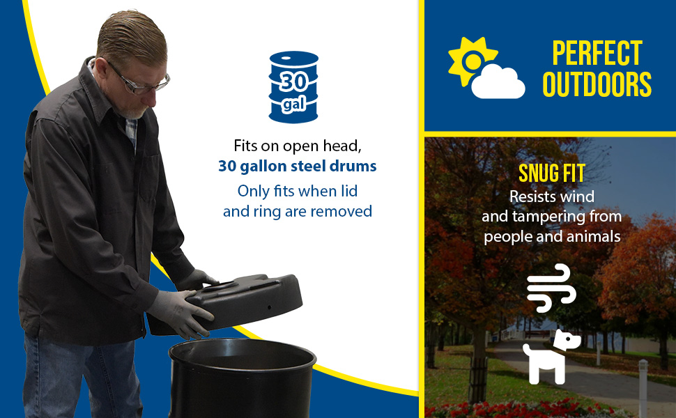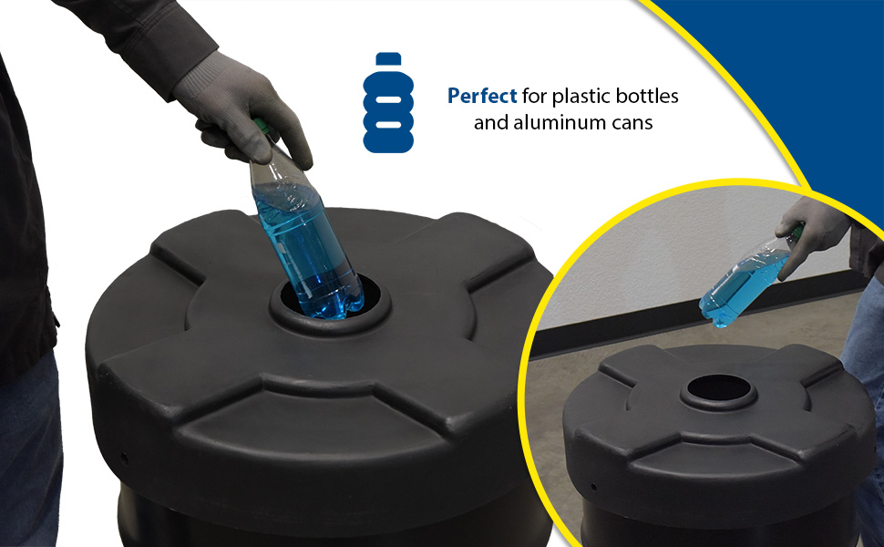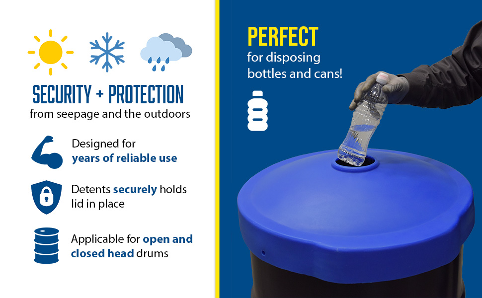 Collecting aluminum cans or plastic bottles could not be easier with Recycling Lids. Fits on open head plastic or steel drums only with lid and ring are removed. Low-density polyethylene construction. Fits snug to resist blowing off in outdoor environments or being tampered with by people or animals. CANF models have a flap to help discourage the removal of contents.