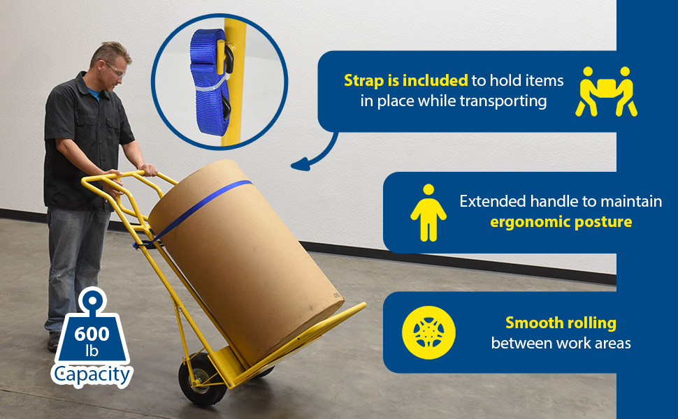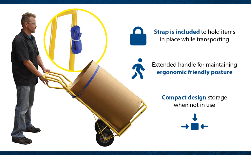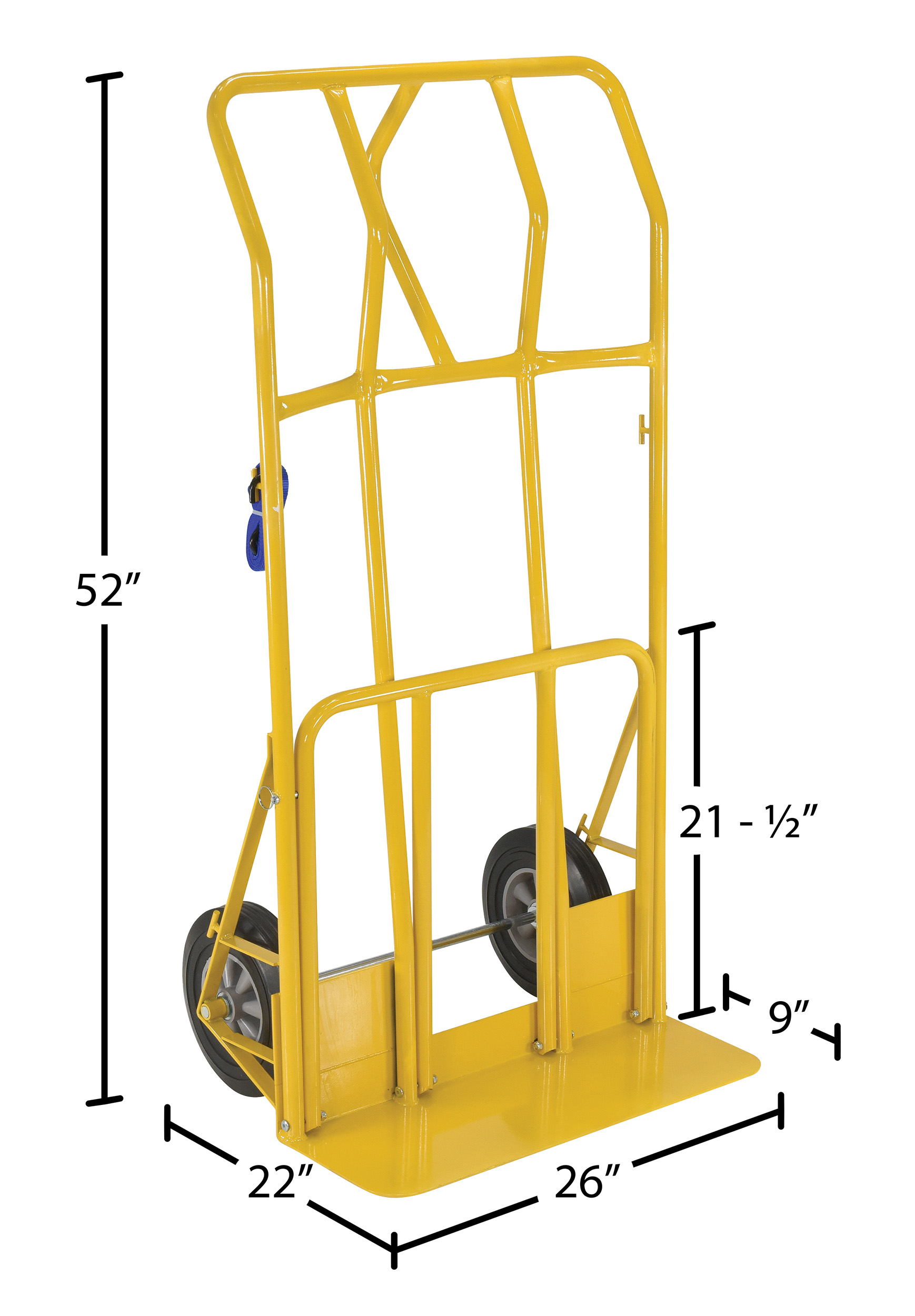 These heavy duty, extra wide hand truck with a folding extension nose plate are ideal for handling large, bulky items. Extra strong tubular, steel frame. Baked-in powder-coated toughness. A strap is included to hold items in place while transporting.