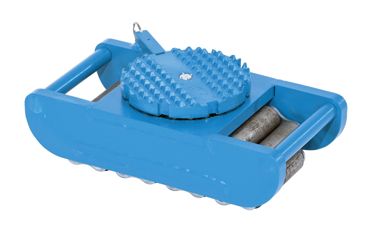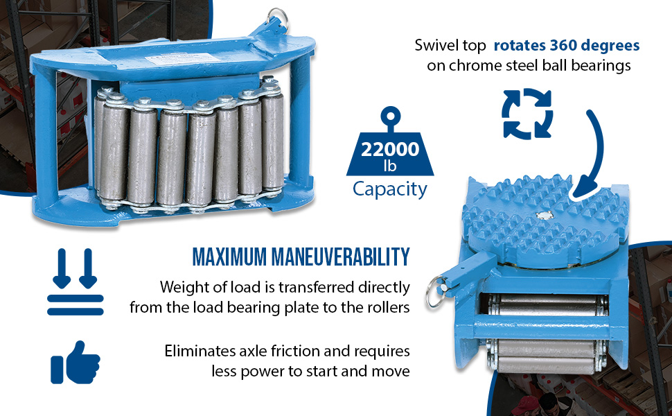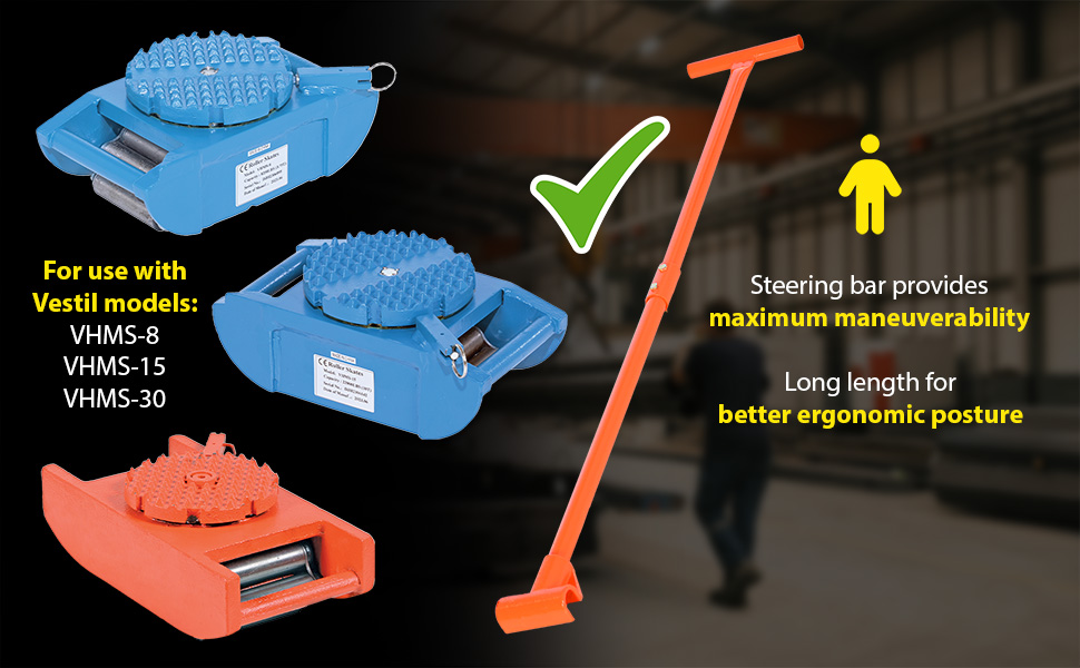 Made of high-strength annealed ductile iron, these Steel Machine Rollers have swivel tops that rotate 360 degrees on chrome steel ball bearings to allow for easier turning. The rollers form a "tank track" to revolve around a center load bearing plate in the frame to provide maximum maneuverability. The weight of the load is transferred directly from the load bearing plate to the rollers, eliminating axle friction and requiring less power to start and move. A spring loaded locking mechanism on the swivel tops, except on model VHMS-2, can be engaged in detents at 45 degrees intervals. These units are virtually maintenance free. Steering bars split in two and connect with sleeve for easy storage.