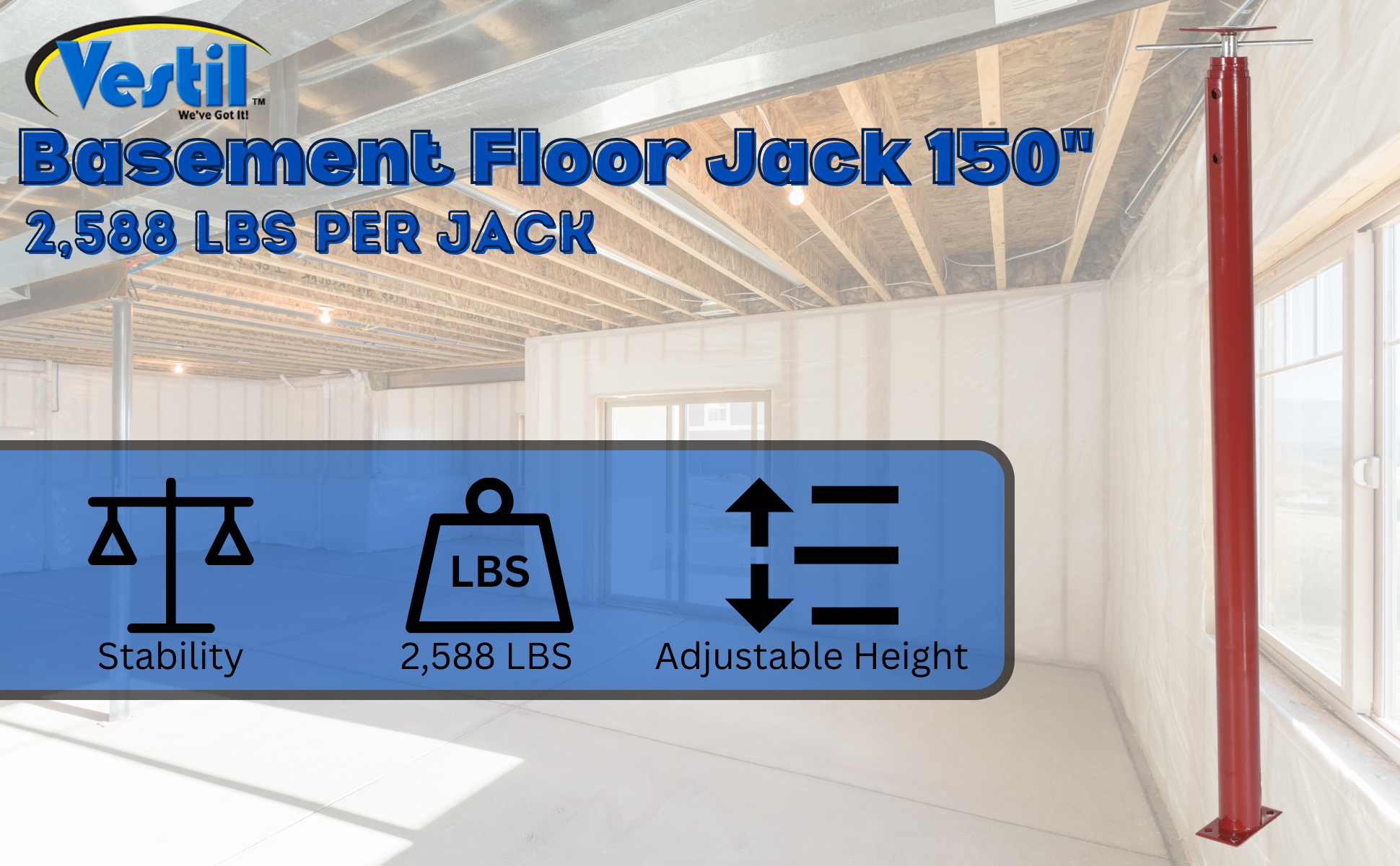 FJB-150 FJB-150Basement Floor Jack 150 In. Maximum Height 2,588 Lb. Capacity RedHeight Minimum/Maximum (in.): 54 to 150