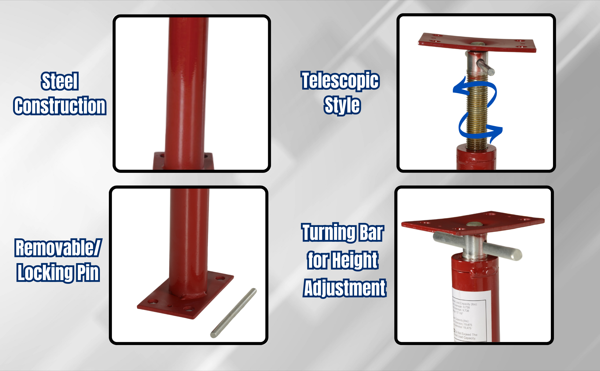 • Includes locking pins and turning bar for easy height adjustment