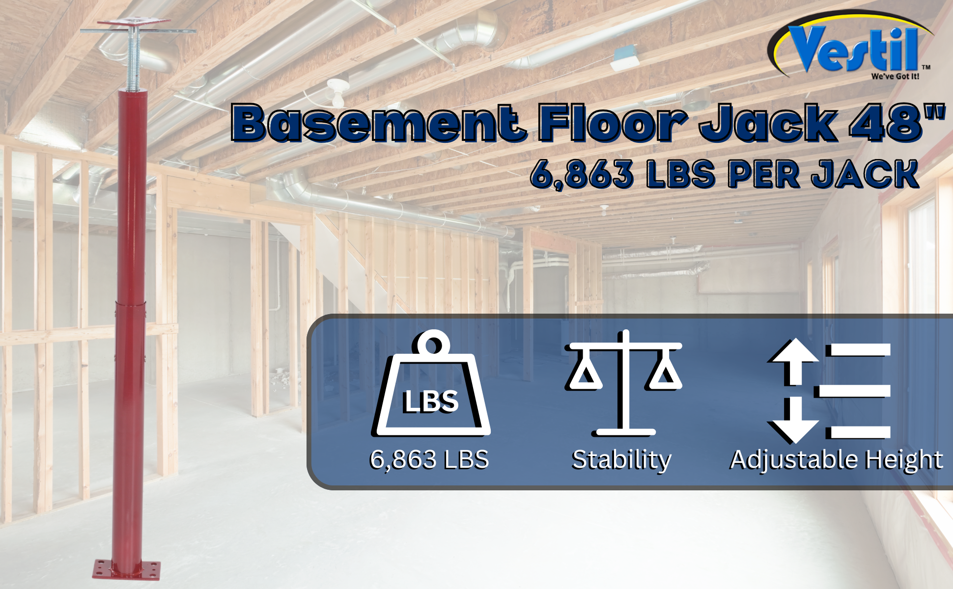 FJB-48 FJB-48Steel Basement Floor Jack 48 In. Maximum Height 6,863 Lb. Capacity RedHeight Minimum/Maximum (in.): 31 to 48