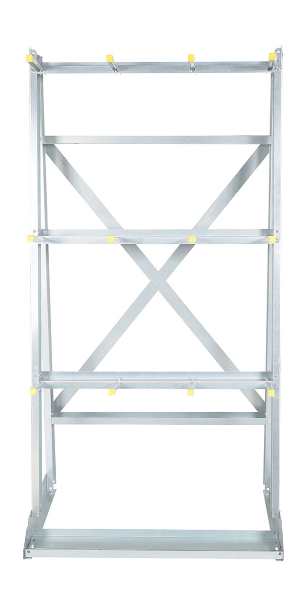 Model SR-SS is a self-supporting 66" high A-frame with 7 storage levels. Arms extend up to 12" beyond A-frame. Base dimensions are 60" by 36". Rack must be statically and uniformly loaded. Capacity for each side equals half the total system capacity. Each support arm must also be statically and uniformly loaded. Shipped knocked down with convenient and quick assembly. Bright zinc plated finish.