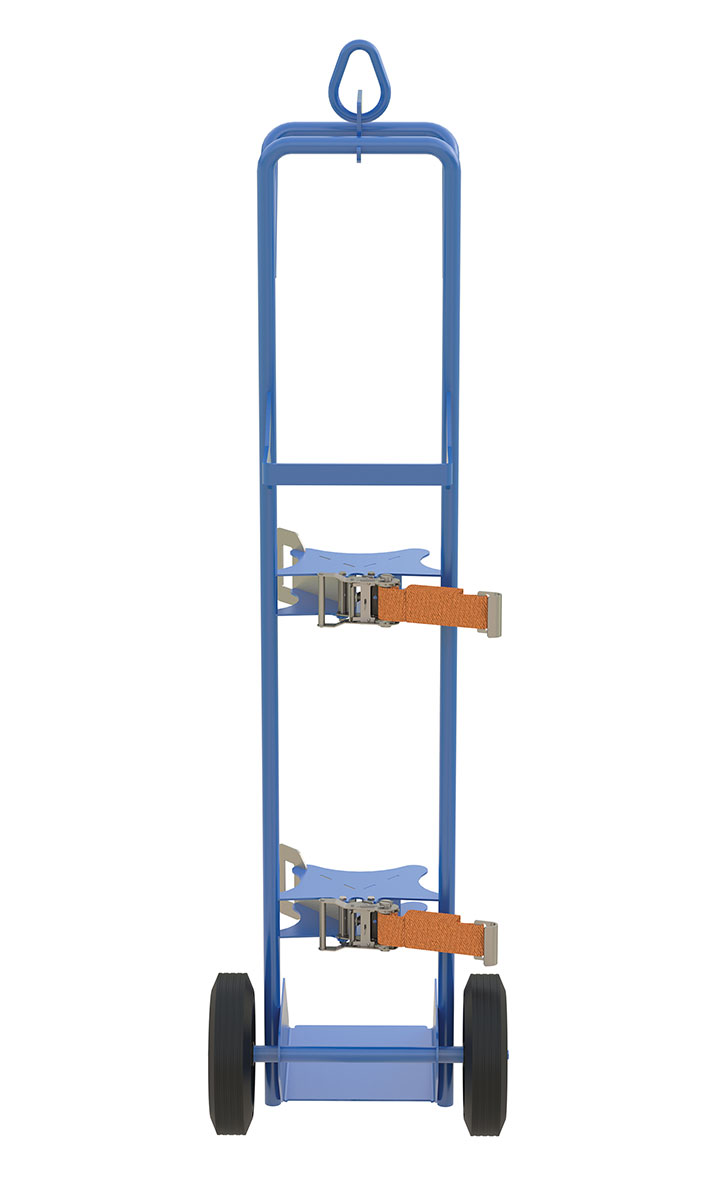 An Overhead Cylinder Lift is equipped to be an asset, no matter the location of the worksite. The lightweight design can be used as a basic cylinder cart to roll the cylinders between areas or it can be lifted. An overhead lifting ring is placed at the top of the model to enable the maneuvering of the unit when the ability to wheel across a surface is not efficient or possible. Security straps are included on the model to protect the cylinder from jostling or changing positions. Nose plate holds a maximum 9" diameter cylinder.