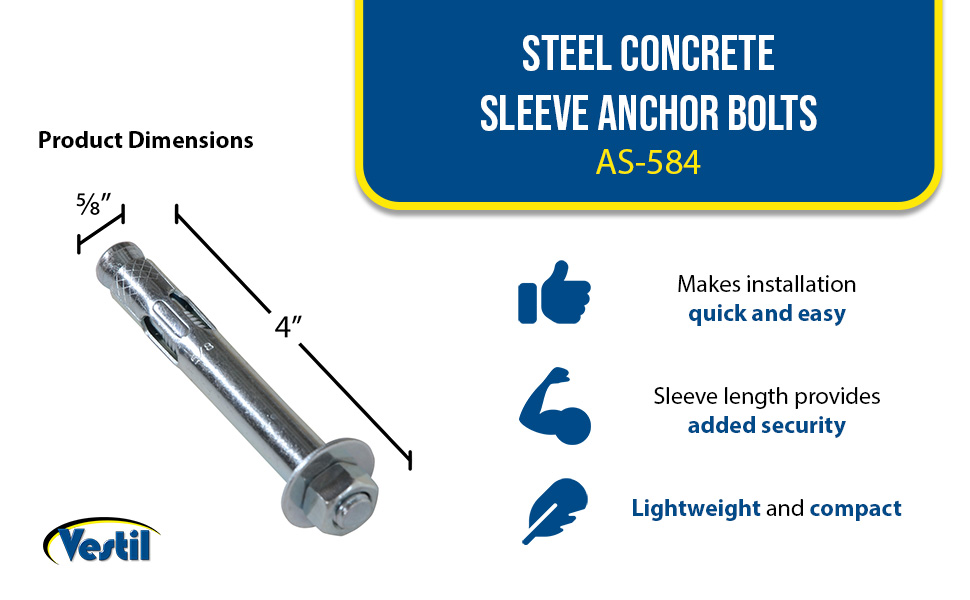 | Steel Concrete Sleeve Anchor Bolts 8 Pack 1/2 In. x 5 In. Silver | Pack (qty.): 8 Sleeve Length (in.): 3 | 4 |