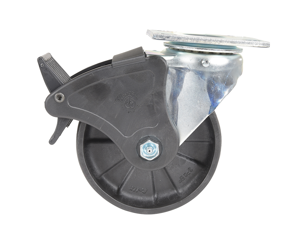 Made of high-tech proprietary glass filled nylon (RX). Provides better impact resistance than standard glass filled nylon. Does not absorb moisture like phenolic, and offers better floor preservation than steel or cast iron. Resists most chemicals, solvents, gases, acids and steam cleaning. Top plate measures 4 x 4-1/2". Black tread color. 85 (+/-5) Shore D. Wheel core material is glass filled nylon.