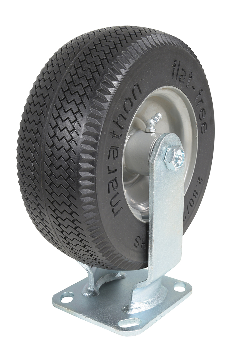 The foam-filled caster provides the same shock absorbent cushion ride a pneumatic does without the worry of flat tires and refilling air. Ideal for outdoor applications.