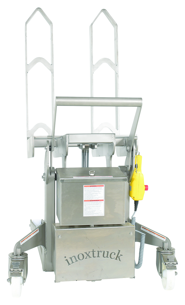 When cleanliness is a must, the tilt master is the perfect asset for the job. A stainless steel construction, with an open design, can be easily cleaned and maintained. The hand held pendant operates the tilting feature to limit the amount of physical activity involved, while also allowing the user to create distance from the tilter during use. Once tilted to the desired position, the user can maintain a more upright posture during use, while minimizing the amount of bending and twisting. Easily accessible battery box for changing and updating batteries as needed. Steering/driving handle is removable.