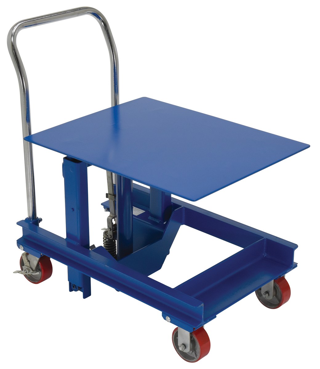 Designed to reduce back injury and cumulative trauma disorders. Lifts heavy equipment to dynamic working height. Foot pump operated hydraulic pump and lift cylinders. All welded steel construction will provide years of service and hard work. Small frame size allows unit to access hard-to-reach locations. Two rigid and two swivel with side brake casters. Suffix "C" represents a chrome top platform on foot pump operated models.