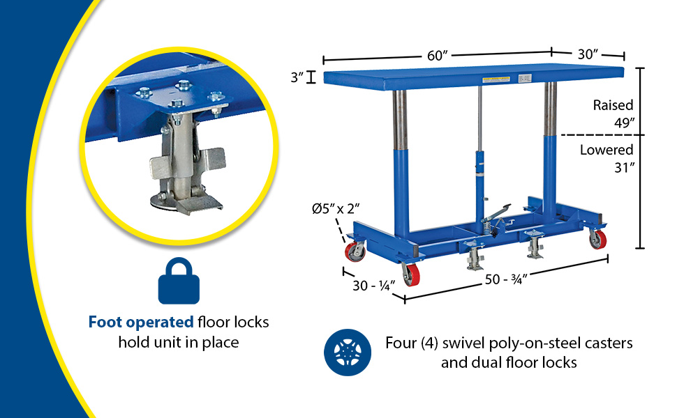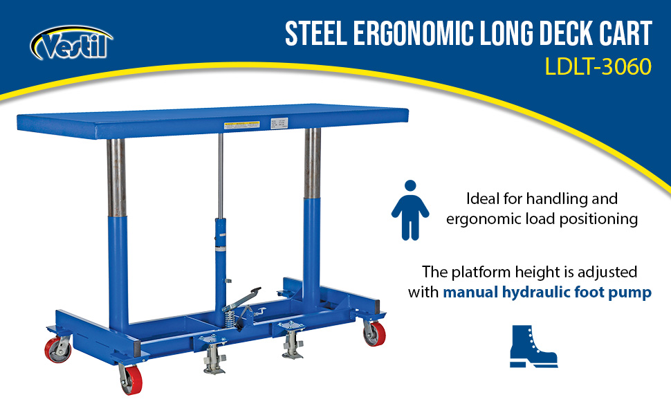 The Long Deck Cart is perfect for sheet and strip handling, ergonomic load positioning, and handling long awkward material loads. Platform height is adjusted with manual hydraulic foot pump. Structural steel base helps to distribute the load evenly. Unit comes standard with (4) swivel 5" x 2" poly-on-steel casters and dual floor locks. (1/4" thick deck)