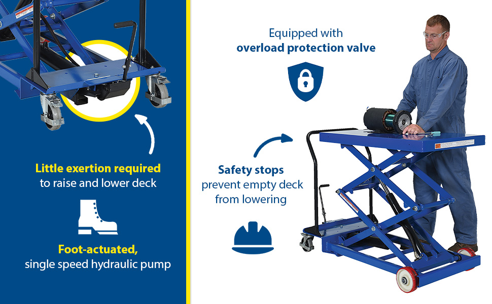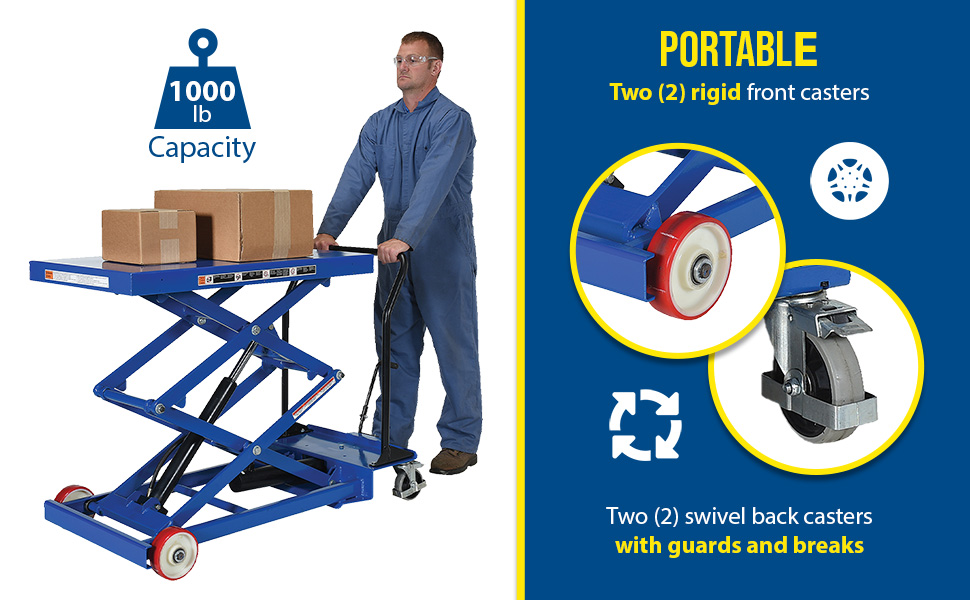 CART-1000-D-FR CART-1000-D-FRSteel Premium Double Scissor Lift Cart with Foot Release 24 In. x 40-1/2 In. 1000 Lb. Capacity BlueUniform Capacity (lb.): 1,000