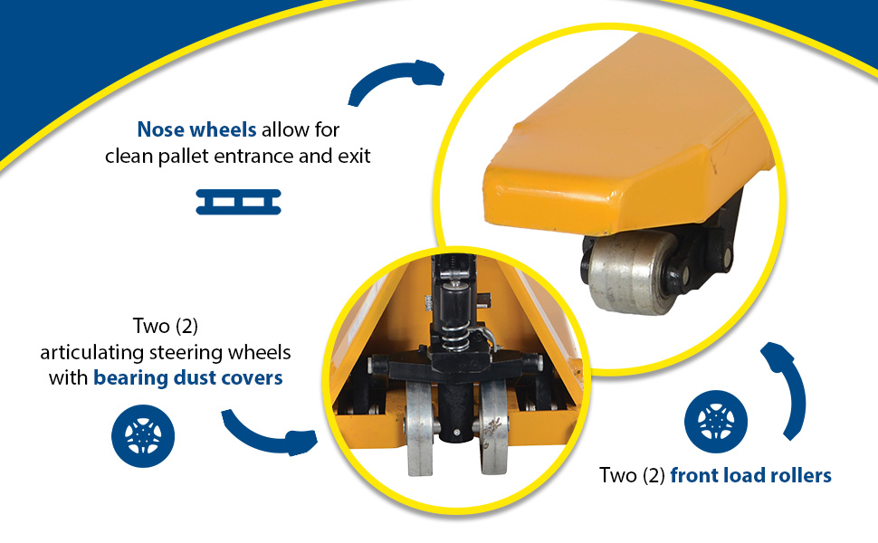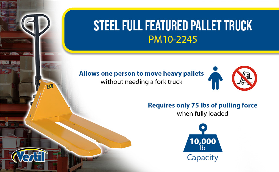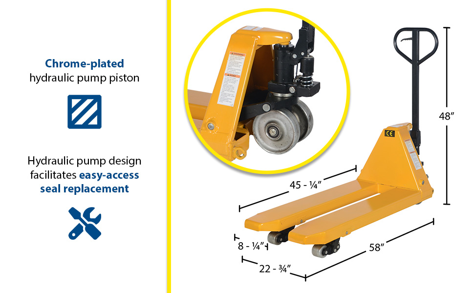 | Steel Full Featured Pallet Truck 58 In. x 22-3/4 In. x 48 In. 10000 Lb. Capacity Yellow | Uniform Capacity (lb.): 10,000 Fork Width/Length (in.): 8-1/2 x 45-1/4 | 423 |