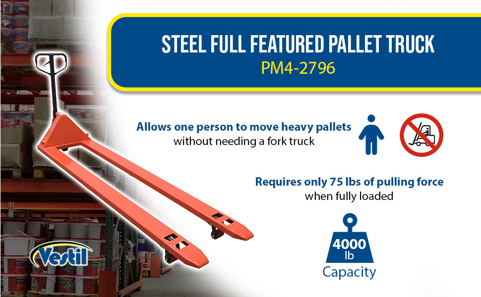 | Steel Full Featured Pallet Truck 112 In. x 27 In. x 48 In. 4000 Lb. Capacity Red | Uniform Capacity (lb.): 4,000 Fork Width/Length (in.): 7 x 96 | 382 |
