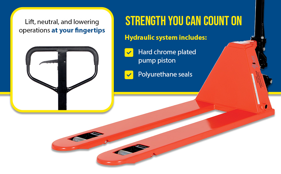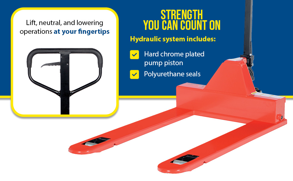 The Low Profile Pallet Truck enters pallets from all four sides. All steel frame is reinforced to handle 4,000 lb. capacity loads. Individual fork width is 7" wide. Wide loop control handle with lift, neutral, and lower functions provides fingertip control. Lifetime lubricated bearings. Hydraulic system has hard chrome plated pump piston with polyurethane seals. Suspension system has a heavy-duty thrust bearing. Complete with adjustable push rods, polyurethane wheels, steel load rollers and red baked-in powder-coated toughness.
