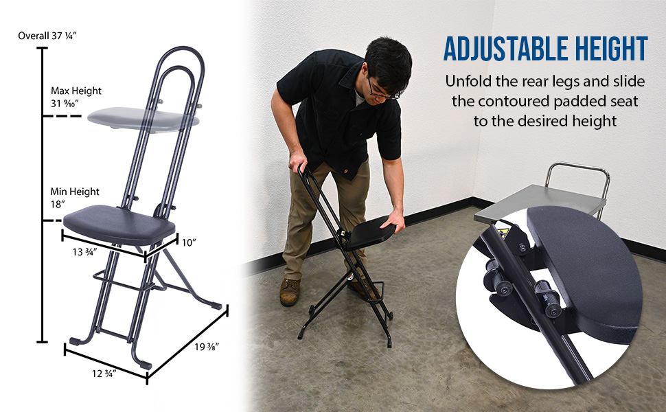 The CPRO-800LP model is not only convenient but easy to use. Simply unfold the rear legs and slide the contoured padded seat to the desired ergonomic height using the infinite adjustment for optimum work posture. Folds up to a 4" profile for easy portability and storage.