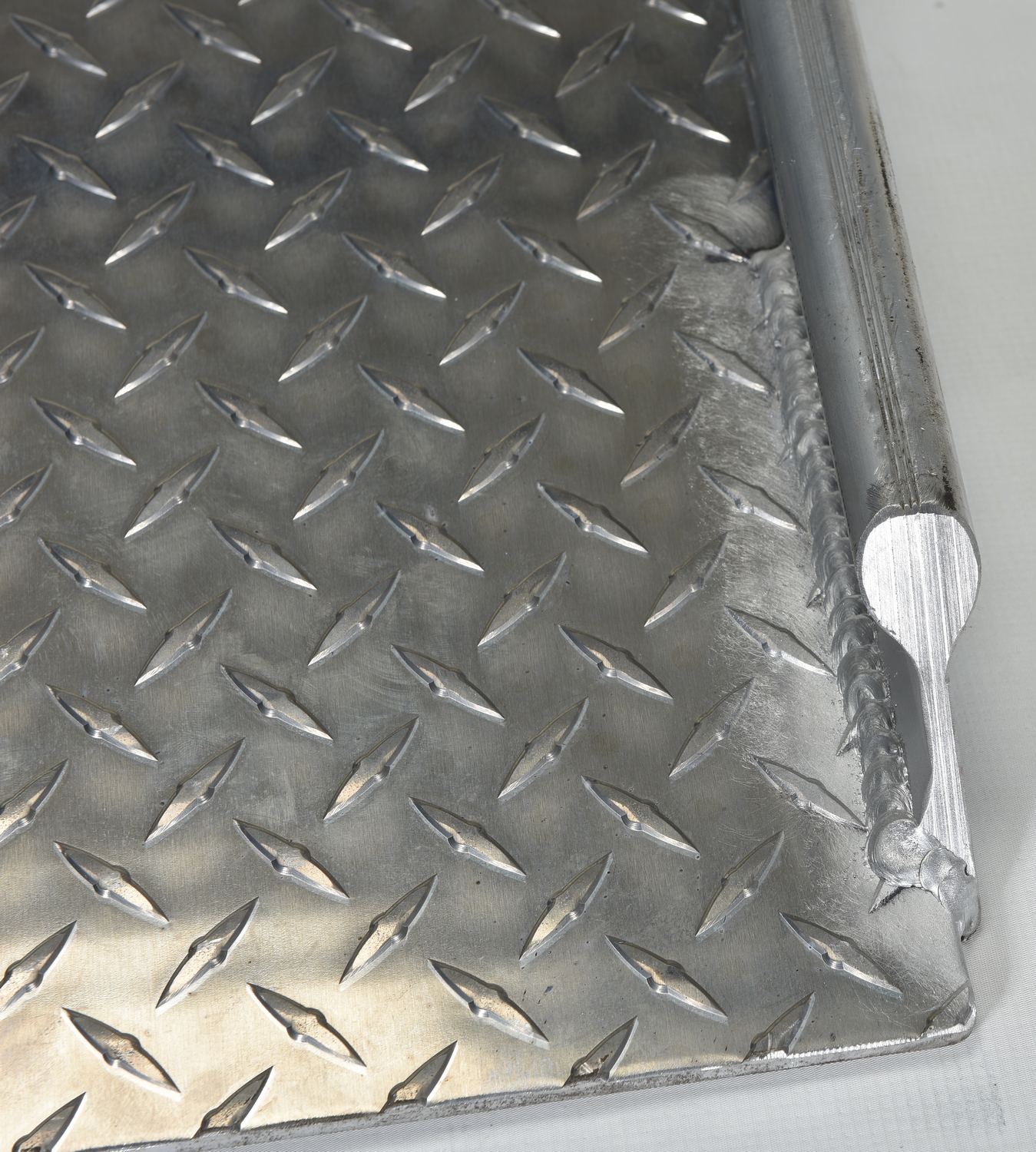 The Aluminum Hand Truck Dockboards are lightweight and can be carried and positioned by one person. Provides a safe and convenient bridge between dock and truck. Welded aluminum diamond tread plate surface and beveled edges provide safe and smooth entry and exit. The 12 degree bend is located 6" from edge and is designed to keep ramp edges flush with the dock surface and the truck floor. The unit is equipped with bolt-on locking legs and full length aluminum curbs that provide hand holds and reduce chance of roll off. 800 lb. uniform capacity. Designed for use with two-wheeled hand trucks. 3/16" plate thickness. Manufactured in compliance with OSHA.