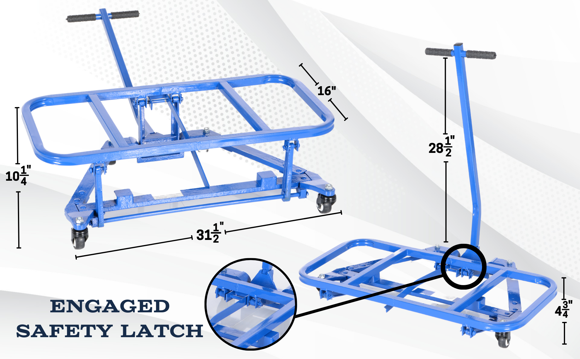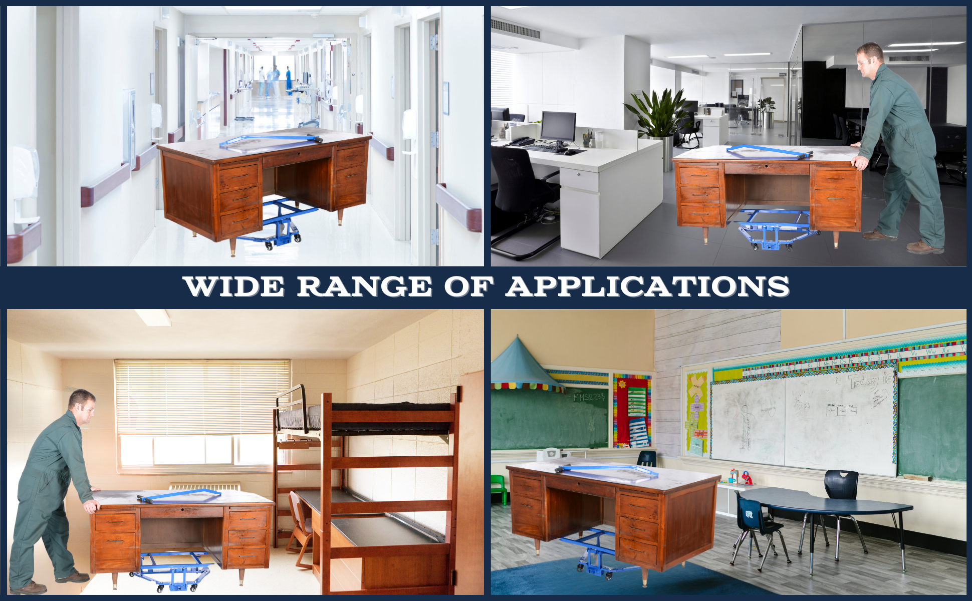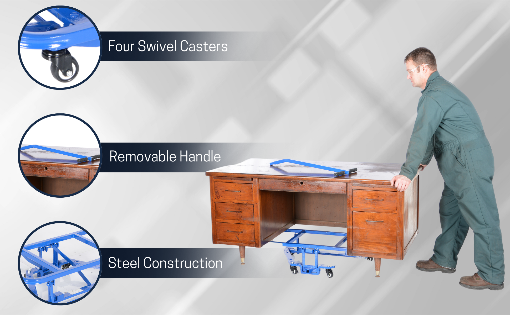 Move fully loaded desks without removing drawers and files. To use: position the 31-1/2" wide by 16" deep platform under desk pedestals, depress handle to raise desk and engage safety latch. Steel lift platform and removable handle have a blue painted finish. Elevated desk moves easily with or without handle on 1-7/8" swivel rubber casters.