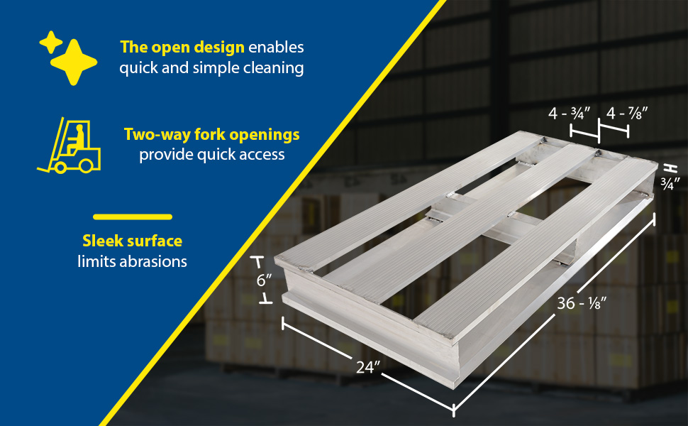 | Aluminum Heavy Duty Half Pallet 24 In. x 36-1/8 In. x 6 In. 4000 Lb. Capacity Silver | Uniform Capacity (lb.): 4,000 Overall Width (in.): 36-1/8 | 17 |