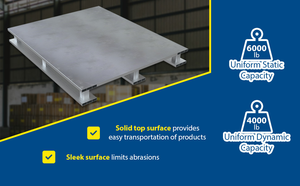 | Aluminum Solid Top with Skid Bottom 40 In. x 48 In. 6000 Lb. Capacity Silver | Static Capacity (lb.): 6,000 Dynamic Capacity (lb.): 4,000 | 113 |