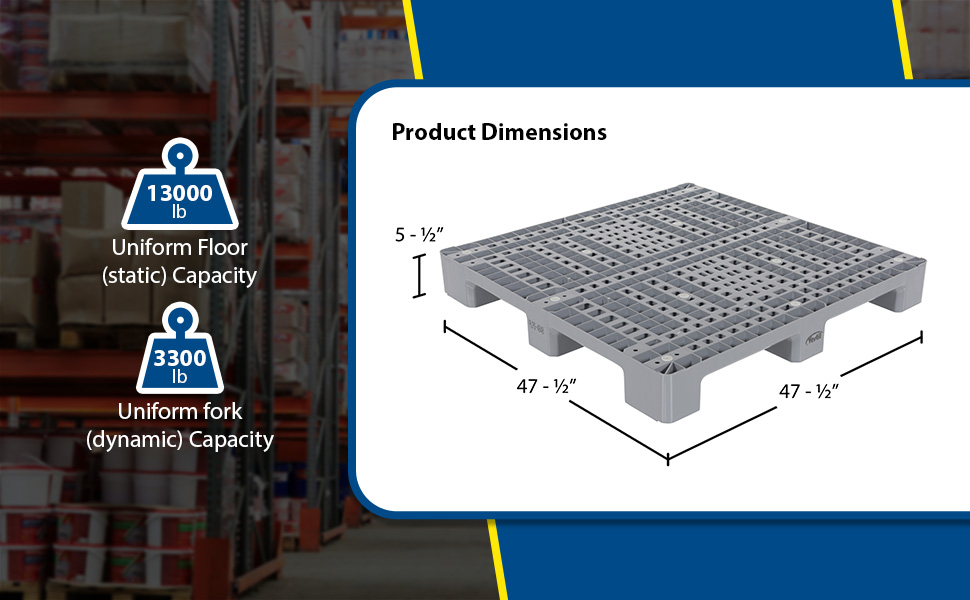 PLPS-4840 PLPS-4840High Density Polyethylene Grated Top Rackable Pallet/Skid 47 In. x 39-1/4 In. x 6-1/2 In. 8,800 Lb. Floor Capacity BlueOverall Width (in.): 39-1/4