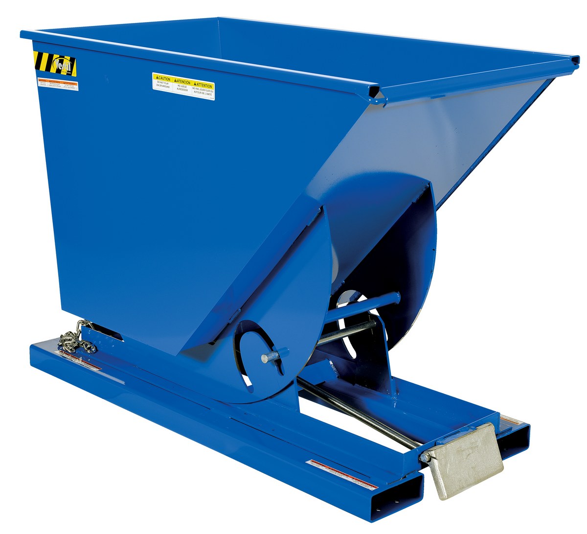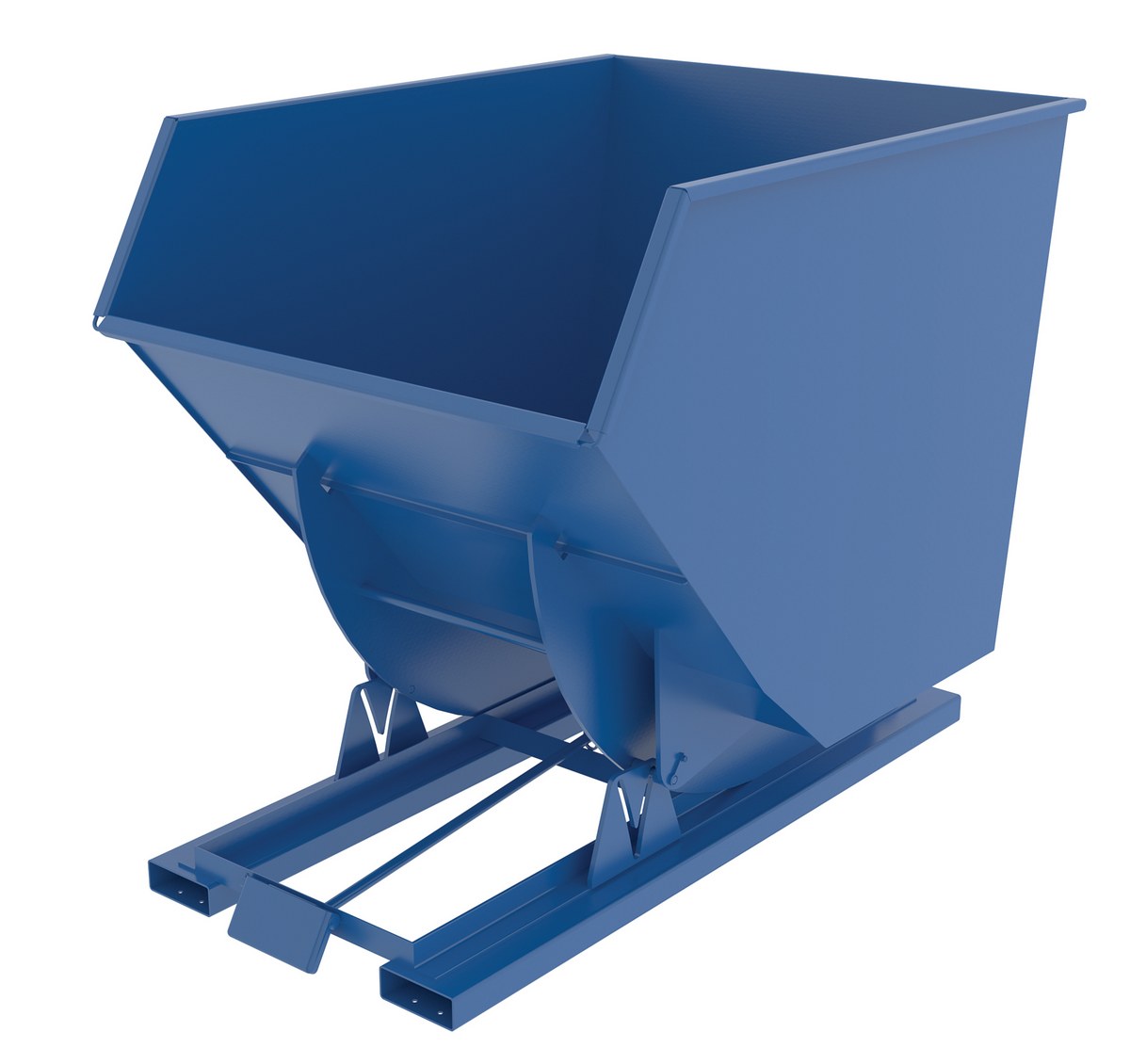 Hopper automatically dumps when bumper release contacts the front of the dumpster. Hopper returns to an upright and locked position automatically after it dumps. Also includes a cable that may be operated from the seat of the fork truck to manually dump the hopper. A safety restraint is provided to secure the hopper to the fork truck. Usable fork pockets are 7-1/2"W x 2-1/2"H. Self-dumping hoppers facilitate compliance with OSHA General Industry rule 29 CFR 1910.178(m)(5)(iii) by allowing lift truck operators to remain at the controls of their truck throughout the dumping process. Optional leak proof design sold separately. D-25, D-33, D-50, D-75, and D-100 are stackable if you stack the top hopper turned 90 degrees from the bottom. Blue baked-in powder-coated toughness is standard.