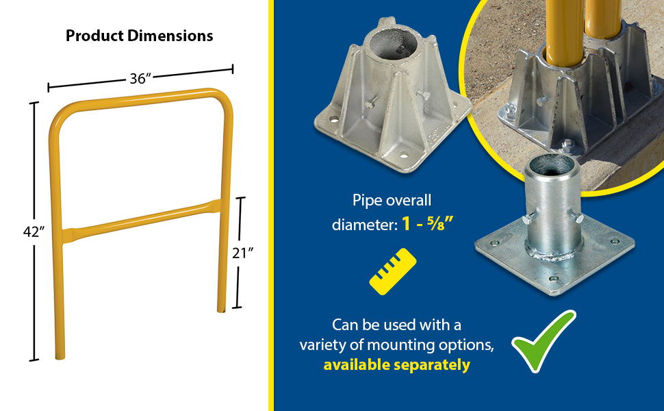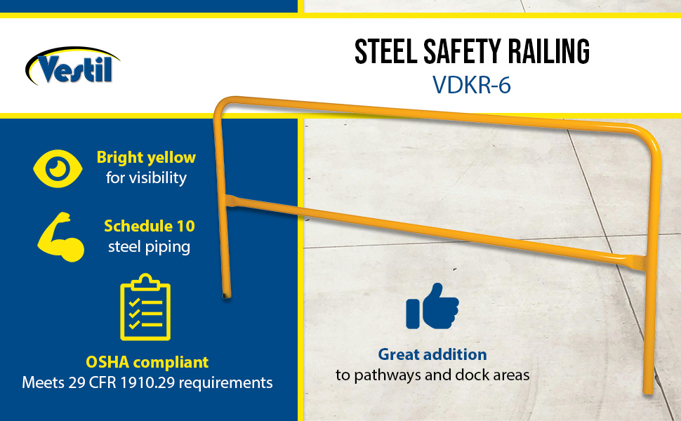 Protect people from uneven walkways and mezzanine drop-off's. The safety railing is constructed of schedule 10 steel. All models have an outside pipe diameter of 1-5/8". Handrails are 42" high with a 21" mid-rail. Mounting options include socket sleeves, cast steel base, barricade base, or cast steel sockets for convenient handrail removal. The cast steel sockets accept wood 2" x 4" or 2" x 6" when toe boards are required. Two (2) lag down holes are pre-drilled for permanently mounting the railing. The steel design includes a baked-in powder-coated finish, which is available in a variety of colors found in the table below. The VDKR series safety rail products comply with U.S. Occupational Safety and Health Administration (OSHA) General Industry requirements for guardrail systems in 29 CFR 1910.29.
