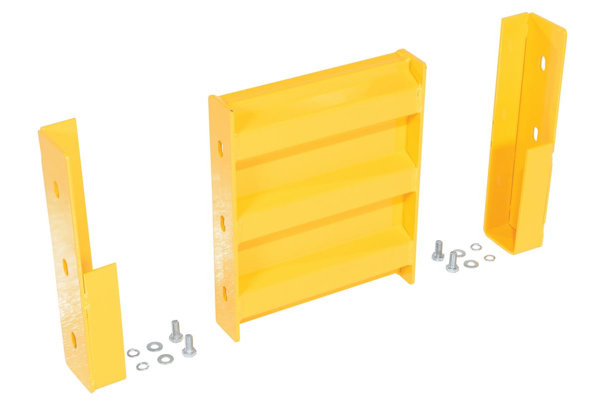 Create a modular system to protect equipment, inventory, and individuals from damage or injury with this highly visible powder coat yellow Structural Guard Rail. Triple ridge corrugated rails are constructed from 1/8" thick material, made for high impact resistance indoors or out. Posts are constructed of round corner 1/4" thick material. The steel base plate measures 10" square and is 5/8" thick. Bolts and washers are provided with individual rail sections. Concrete mounting kit is available separately. Provide a strong barrier with easy accessibility with our Drop-In Style rails. Slide rail sections into post saddles for simple assembly. Each Drop-In Style rail section includes two brackets. Bolt-On Style rails are designed for permanent installation. Models GR-TP-YL and GR-TP-GAL posts include mounting holes on all four sides for use in corners or center posts.