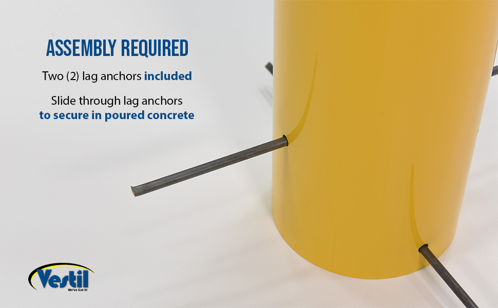 Make your bollards permanent by setting them in concrete. The extra length of the Pour in Place Bollard allows you to maintain the needed height while fixing the bollard in concrete. Bollard comes with slide through lag anchors and a removable cap so the bollard can be filled with concrete to increase its strength and durability. Baked-in powder-coated or hot dipped galvanized finish for added toughness. Assembly required.