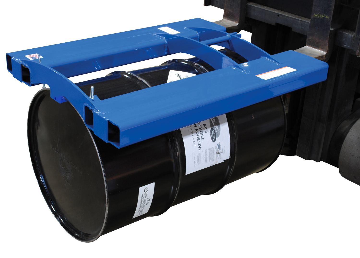 Designed to load and unload open or closed head drums horizontally in racks. Safety Restraint secures cradle to the forks to maximize safety and productivity. Drum lock engages and disengages automatically as a function of the fork angle. Fork pockets measure 7-5/8" wide by 2-5/8" high usable.