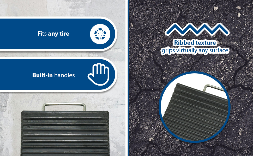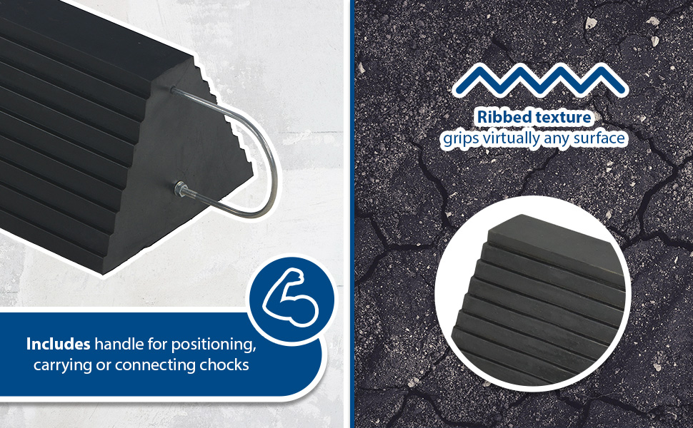 Constructed of reinforced rubber to provide a sure grip on virtually any surface. Curved surface contours to fit tires. Rubber resists tearing, abrasion, ozone weathering, etc. Functional design is durable in all weather conditions. Series RWC-8 is constructed of a mix of virgin and recycled, no reinforcement cords. Airline Chocks (AC series) are suitable for small and large aircraft. Model AC-13 Includes a 36" polypropylene rope while AC-18 has a 24" long polypropylene rope between the chocks.