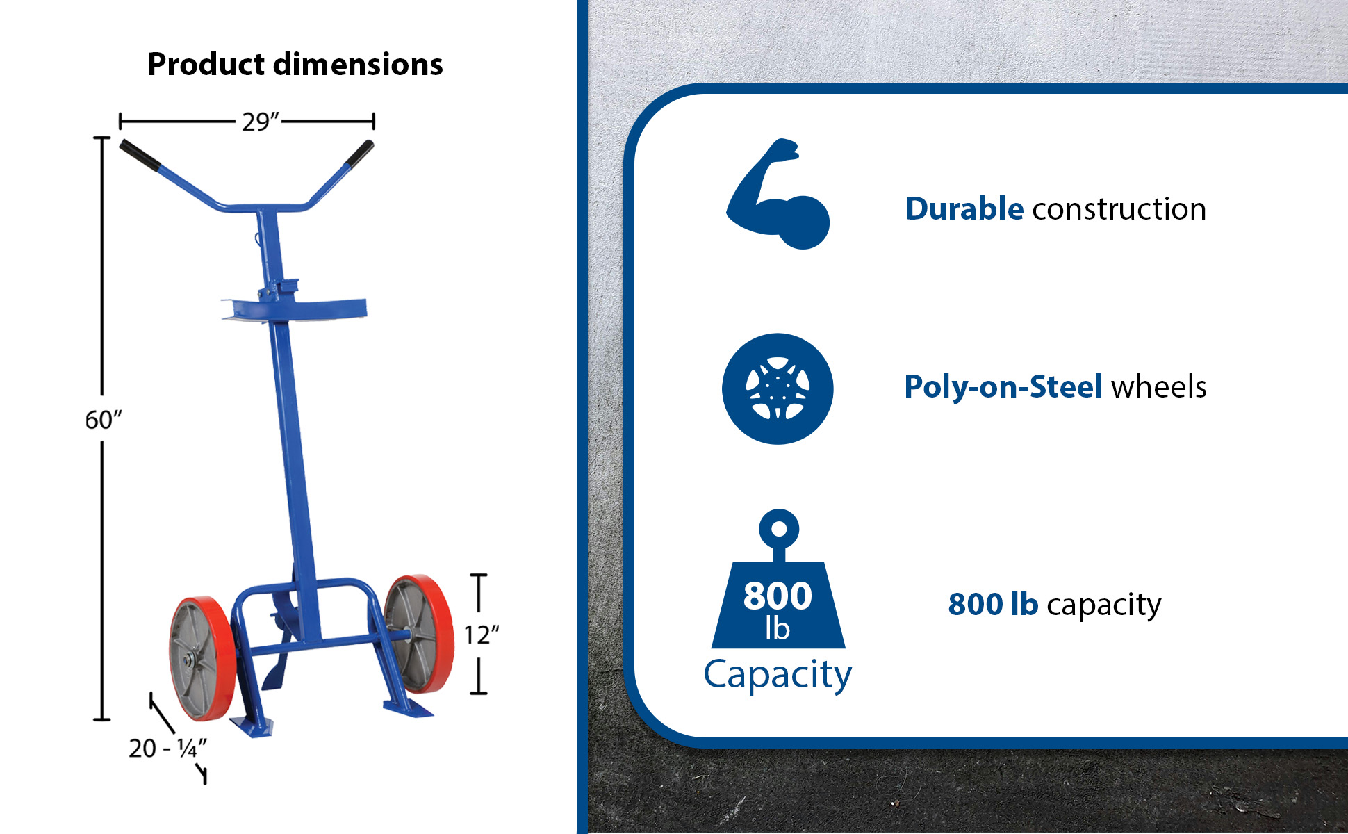 DBT-1200-P DBT-1200-PSteel Barrel/Drum Truck with Poly On Steel Wheels 20-1/4 In. x 29 In. x 60 In. 800 Lb. Capacity BlueUniform Capacity (lb.): 800