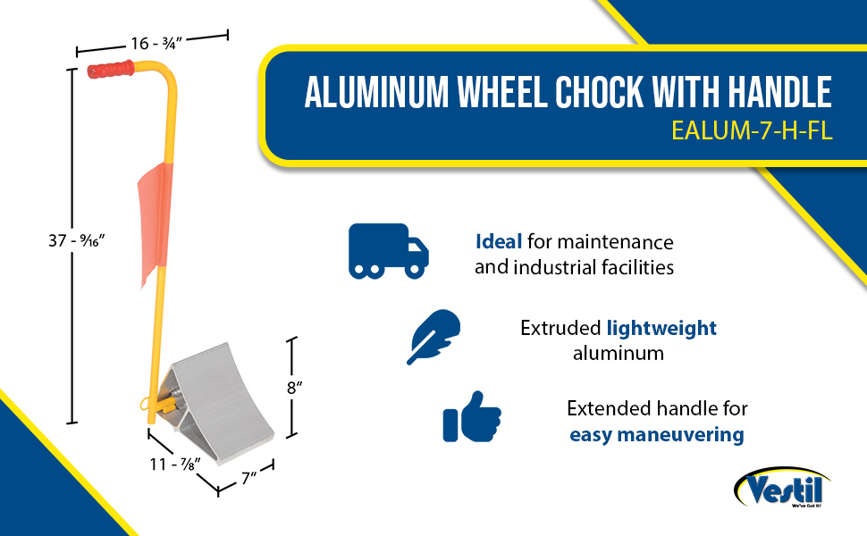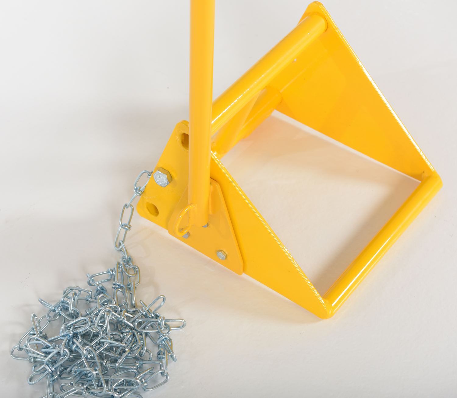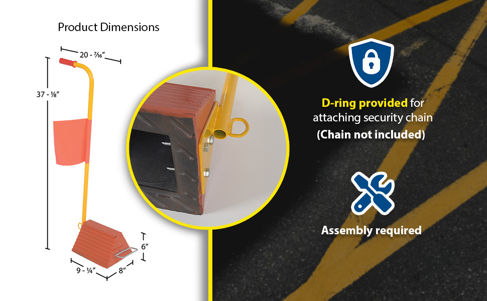 Ergonomically designed to make it easy to move wheel chocks in and out of position under trailer wheels. Reduce the risk of back, knee, and foot injuries. Handle is constructed of steel and includes a yellow baked-in powder-coated toughness. D-Ring provided for attaching security chain (chain not included.) Assembly required. High Visibility Flag |