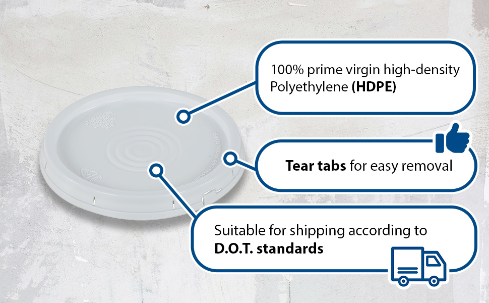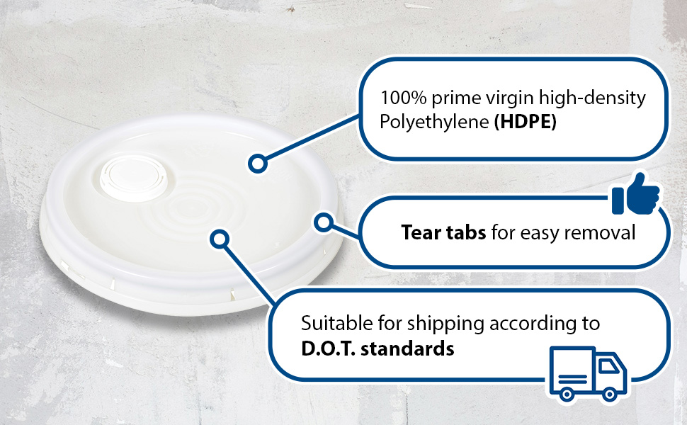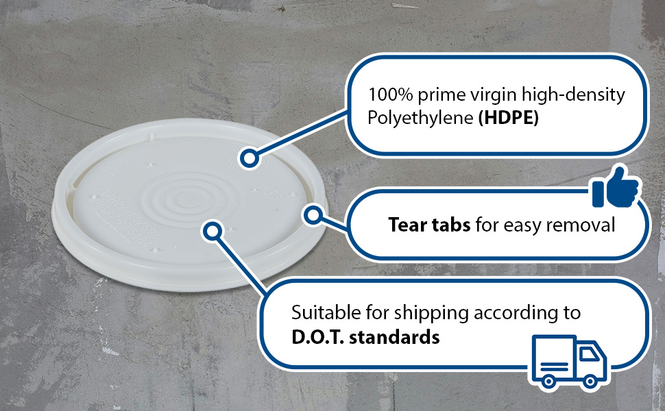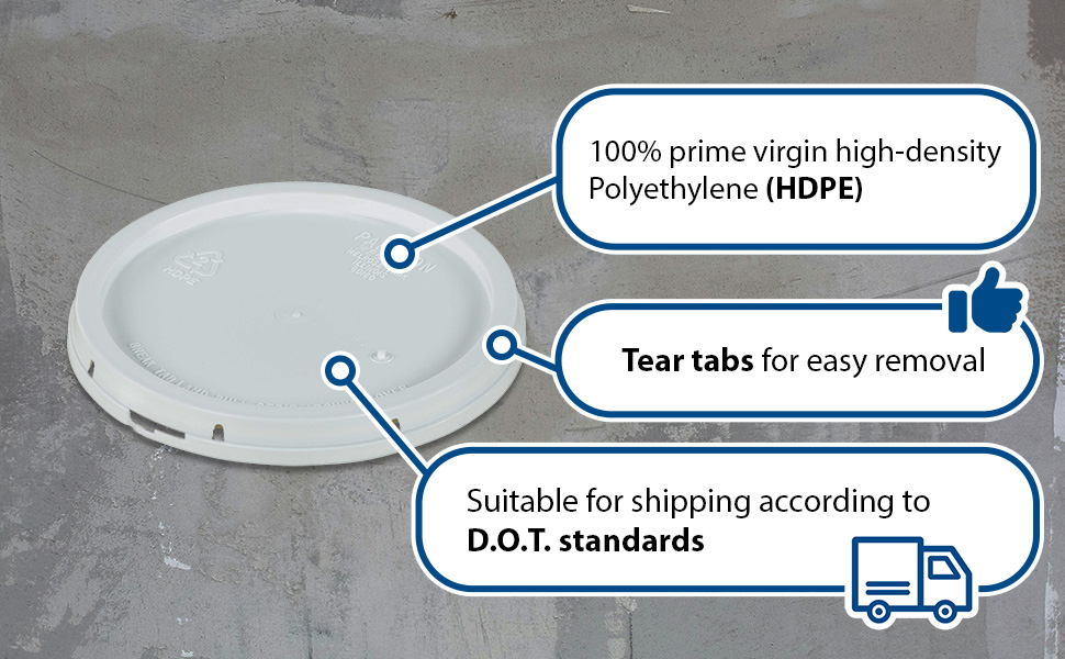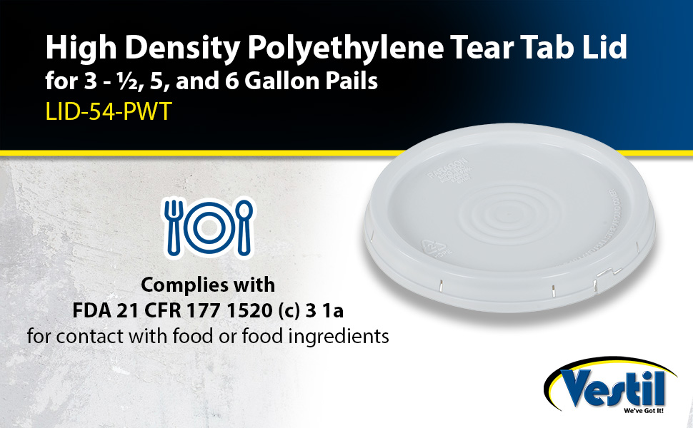 LID-54-PWT LID-54-PWTHigh Density Polyethylene 3-1/2, 5 and 6 Gallon Tear Tab Lid WhiteAccommodating Pail Size (gal.): 3.5 , 5, 6