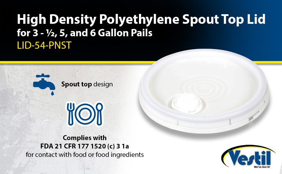 LID-54-PNST LID-54-PNSTHigh Density Polyethylene 3-1/2, 5 and 6 Gallon Spout Top with Tear Tab NaturalAccommodating Pail Size (gal.): 3.5 , 5, 6
