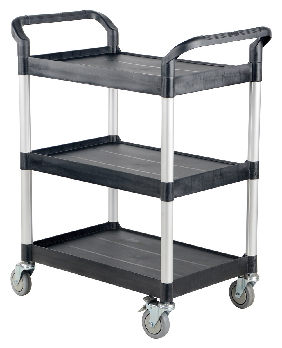 The food and service cart is ideal for the hospitality industry. The secure grip handles on the strong, yet, lightweight frame makes for easy maneuverability, while the low noise thermoplastic casters make transportation as quiet as possible. The steel constructed panels and slider drawer protects material from outside harm as well as accidental falling. Additionally, the semi-textured surface with perimeter lip prevents sliding of products while still being easily cleanable.