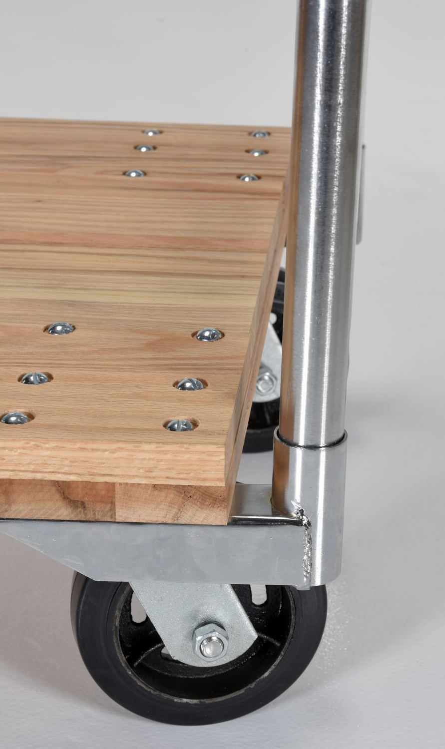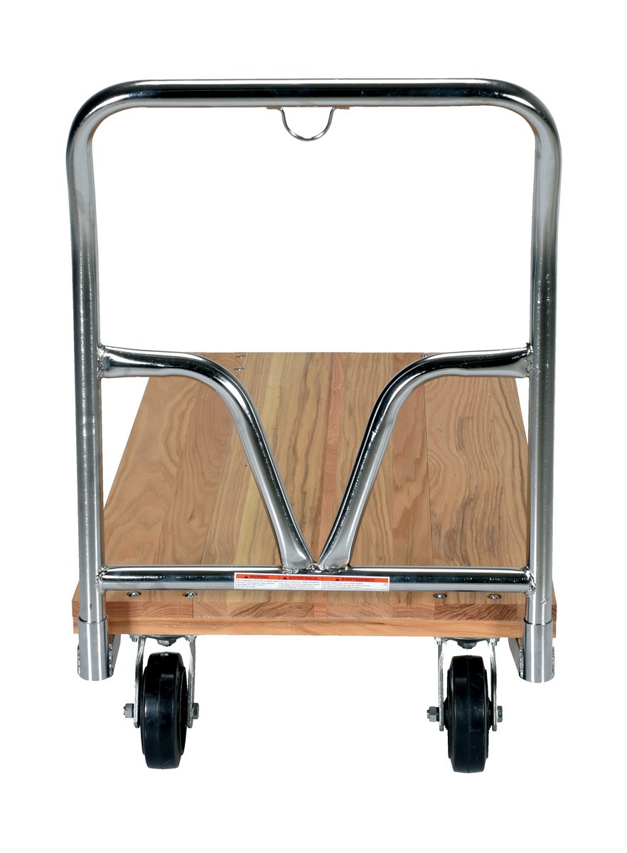 Hardwood Platform Trucks are the economical solution to your material handling needs. Constructed of nominal 1" thick hardwood, these platform trucks have a maximum capacity of 1,600 pounds. Units roll smoothly on 6" x 2" mold-on-rubber casters, two rigid and two swivel. Casters and removable steel push handle are bolted on. Countersunk holes allow for a smooth deck surface.
