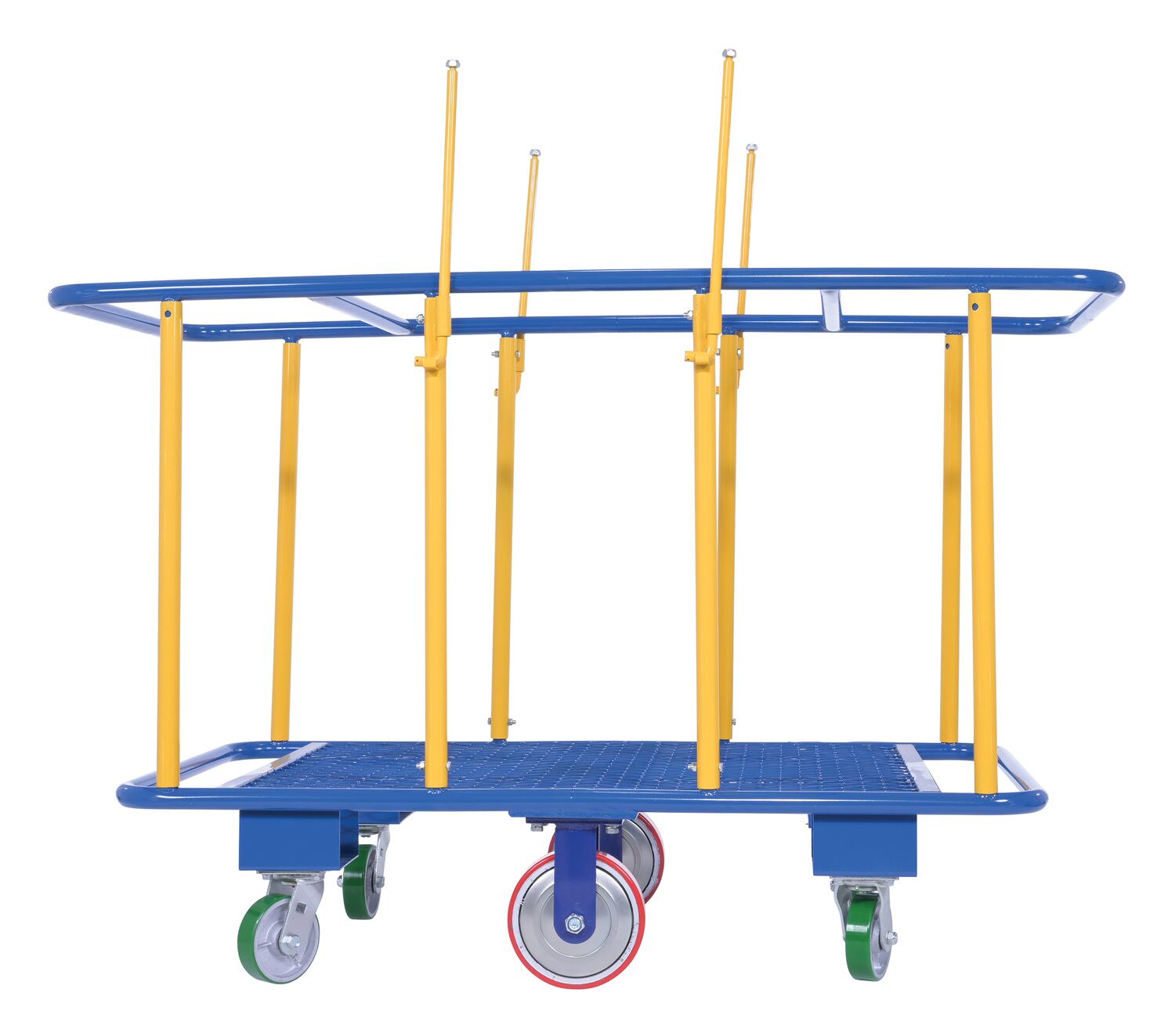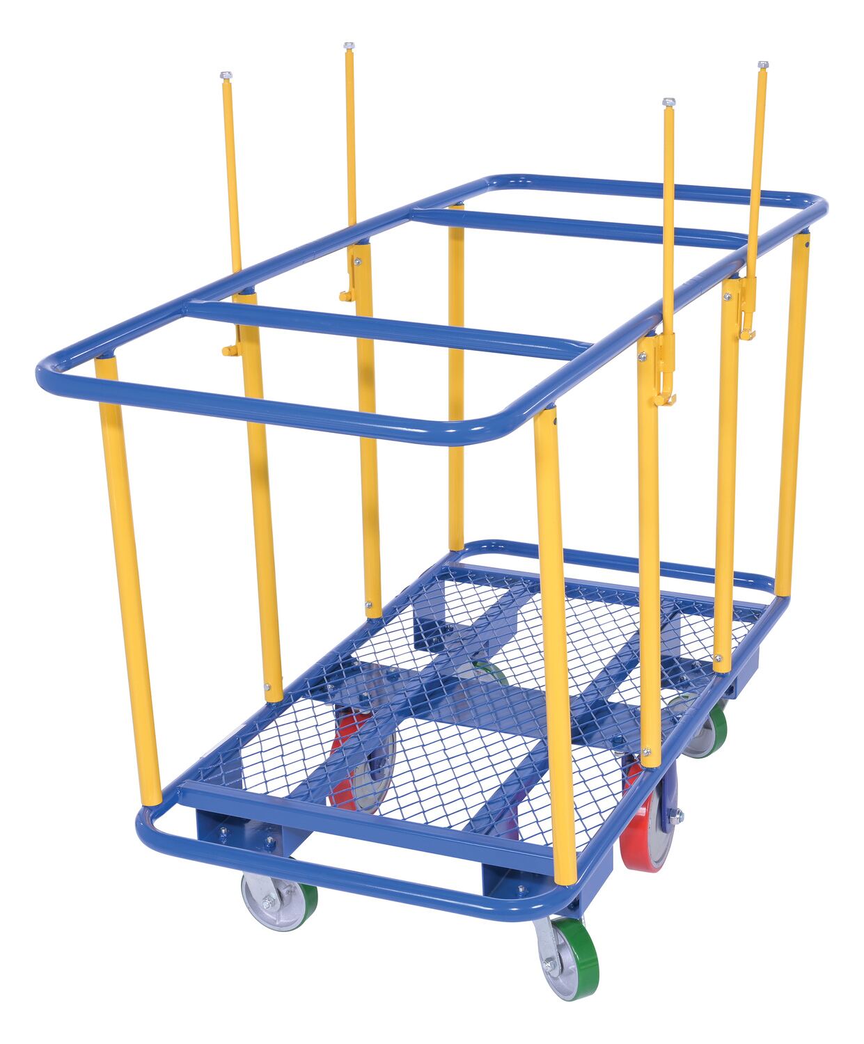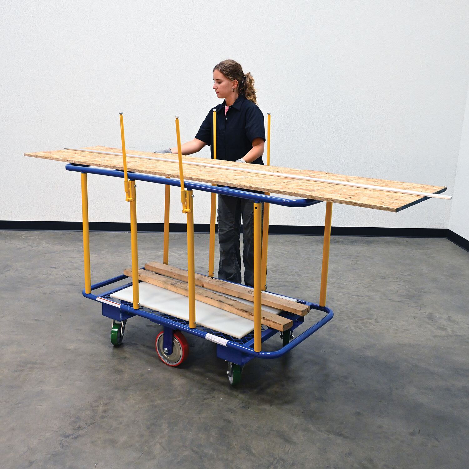 This two tier cart is great for handling panels and small items. The top dock is 40-15/16" high while the bottom dock is 11-2/3" off the ground. Four sliding posts can be locked in the up position to prevent products from sliding. Rolls on (4) 5" x 1-1/2" swivel and (2) 8" x 2" rigid casters. Center casters provides great maneuverability.