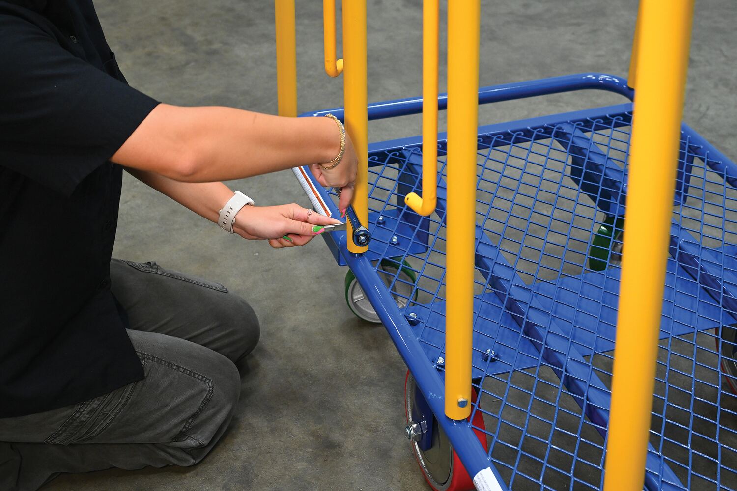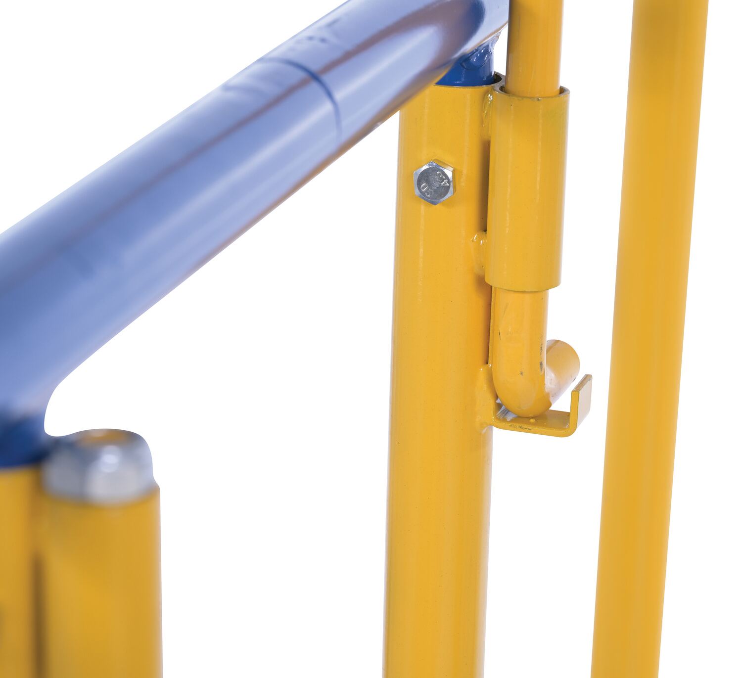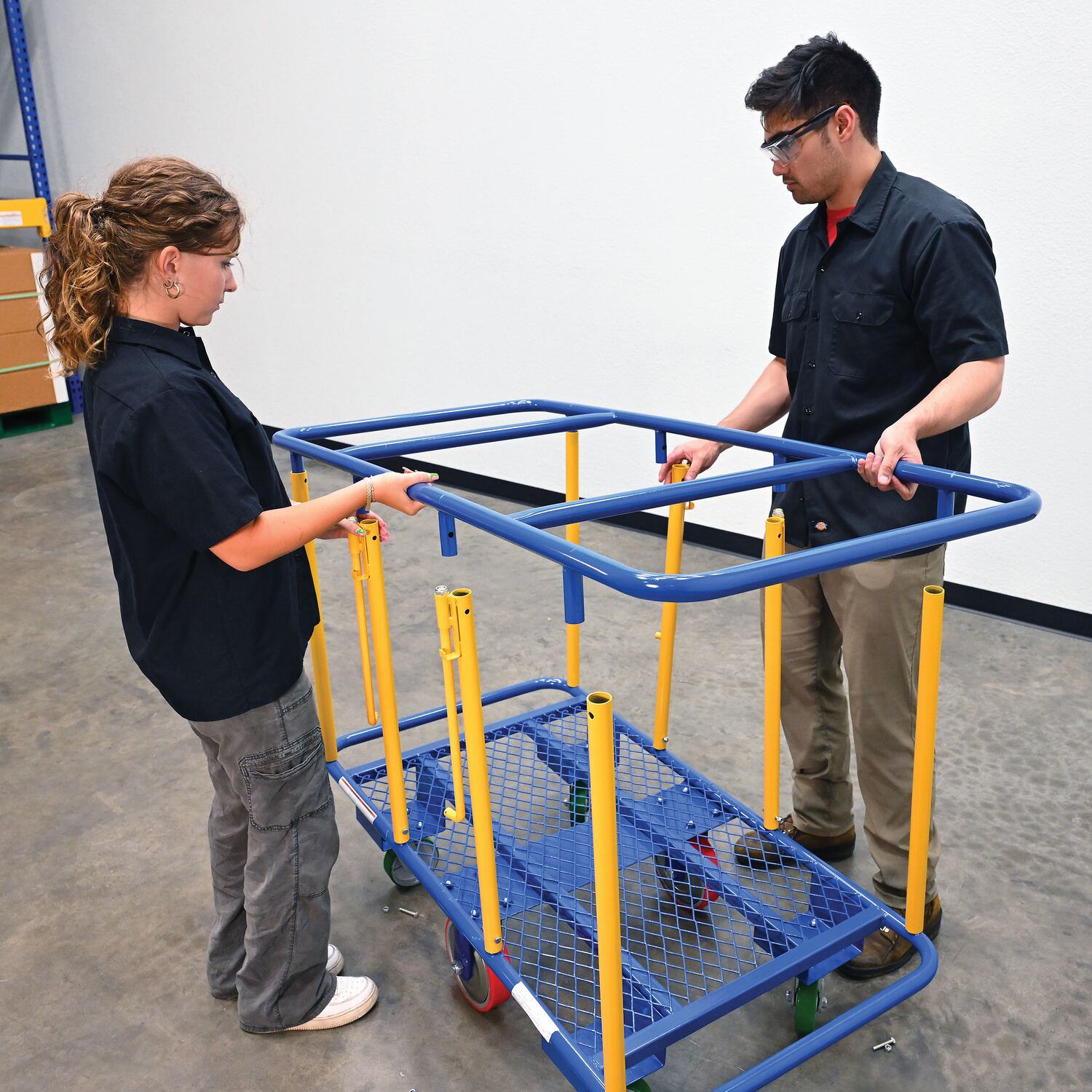 This two tier cart is great for handling panels and small items. The top dock is 40-15/16" high while the bottom dock is 11-2/3" off the ground. Four sliding posts can be locked in the up position to prevent products from sliding. Rolls on (4) 5" x 1-1/2" swivel and (2) 8" x 2" rigid casters. Center casters provides great maneuverability.
