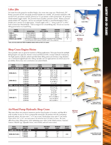 lifting heights and capacities. Boom is raised and lowered with a manual hydraulic hand pump.