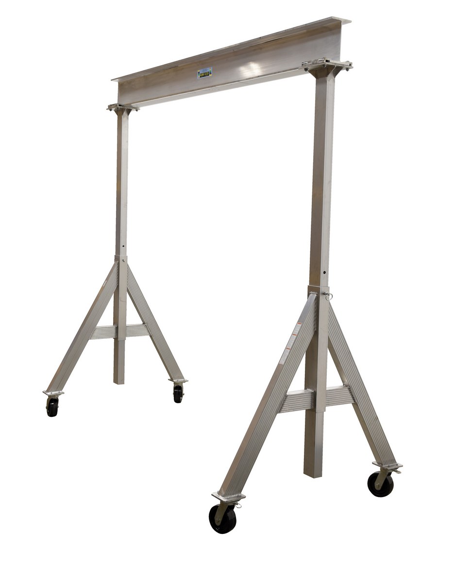 The adjustable height Aluminum Gantry crane combines lightweight and rigid, sturdy construction into one unit. The all aluminum construction of this gantry crane makes it corrosion resistant and perfect for outdoor use. The lightweight I-beam allows for simple height adjustments. All pinned connections make it possible for single person set up and take down in just minutes. Included are two (2) straps, allowing one person to transport the gantry crane in one neat package.