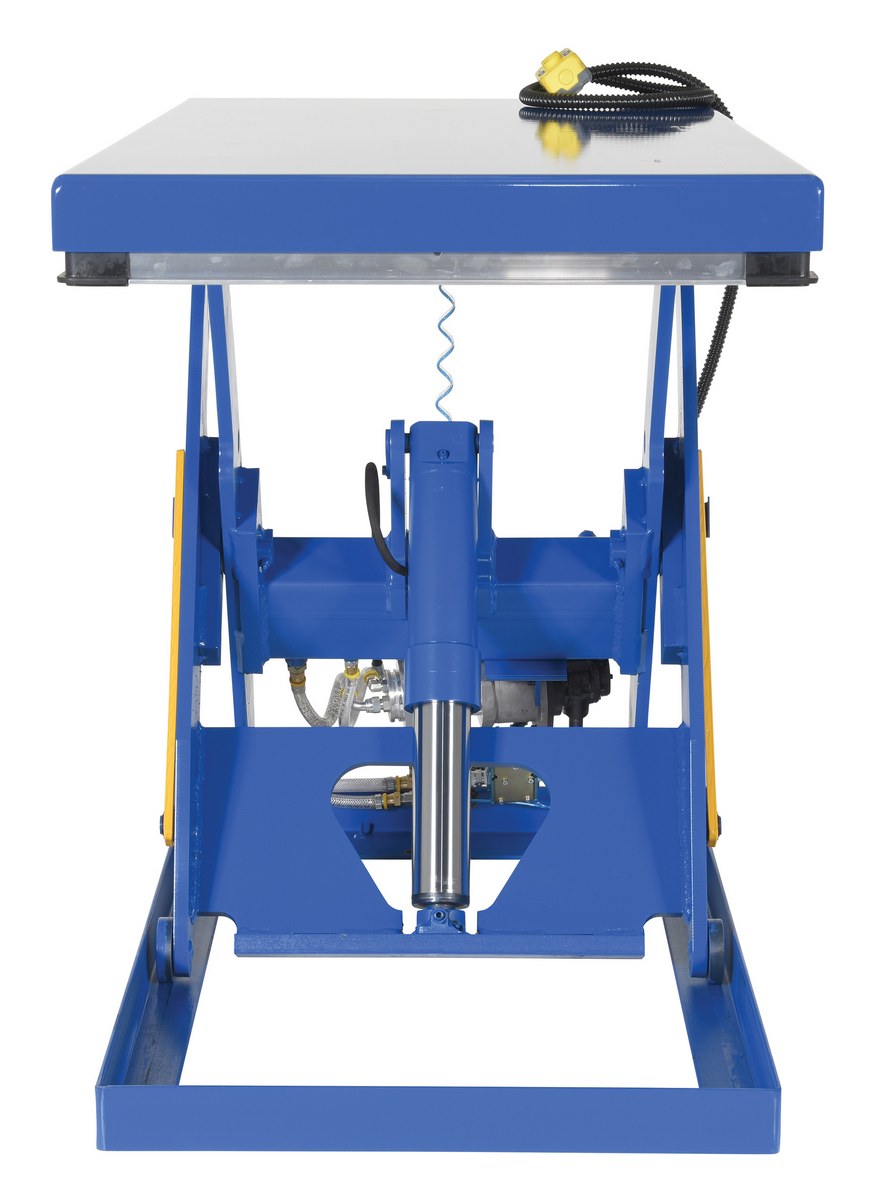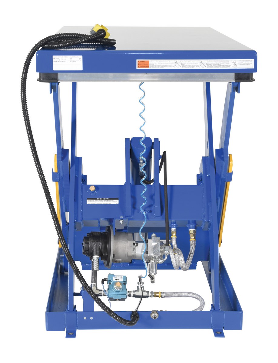 The rotary air/Hydraulic scissor lift table utilizes the convenience of factory air to power the lift table. Simply connect to an air supply through a filter, regulator, lubricator, and you will have a lift table suitable for a wide range of applications and operating environments. It features a pneumatic upper travel limit switch, safety toe guards, cylinder with internal safety velocity fuse, two button hand control, and life-time lubricated sleeve bearings.